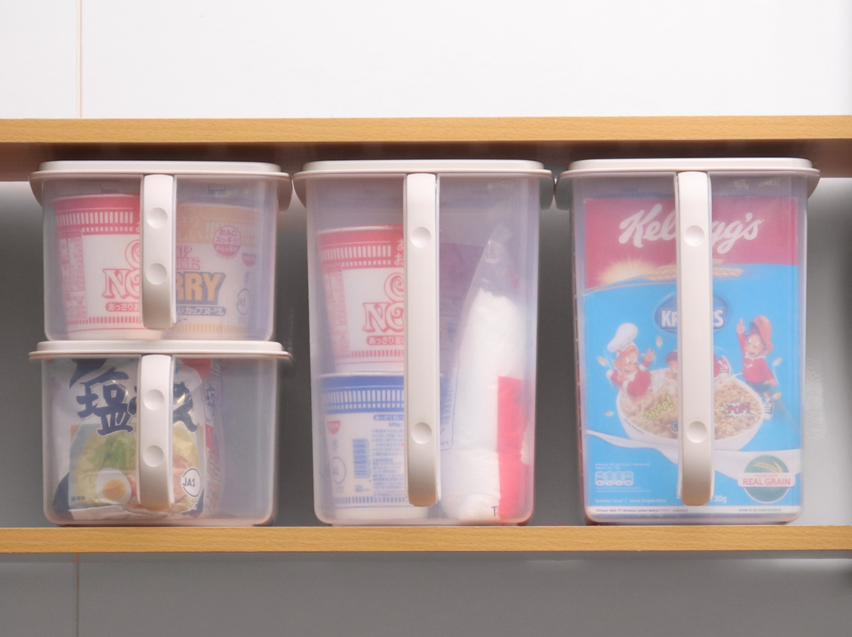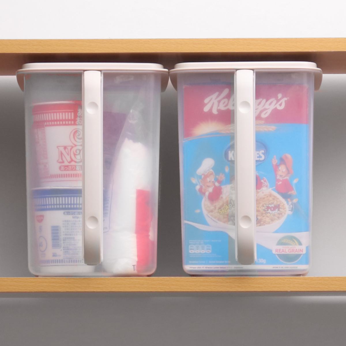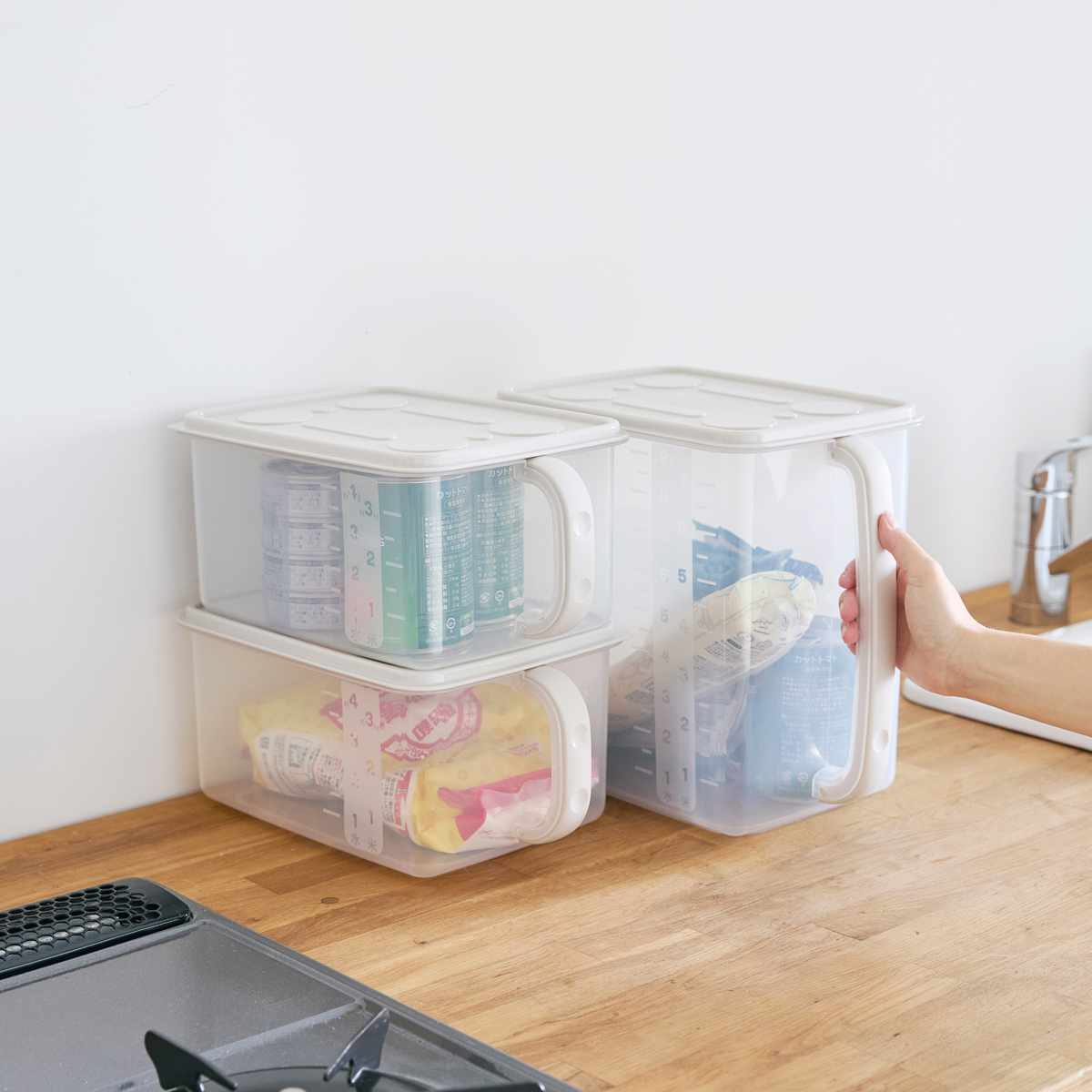 ストック用品などの収納に便利な整理ストッカーです。ケースが透明なので、吊戸棚に収納しても中に何が入っているか一目でわかり、迷わずサッと取り出すことができます。握りやすい大きな取っ手が付いているので、取り出しやすいです。
