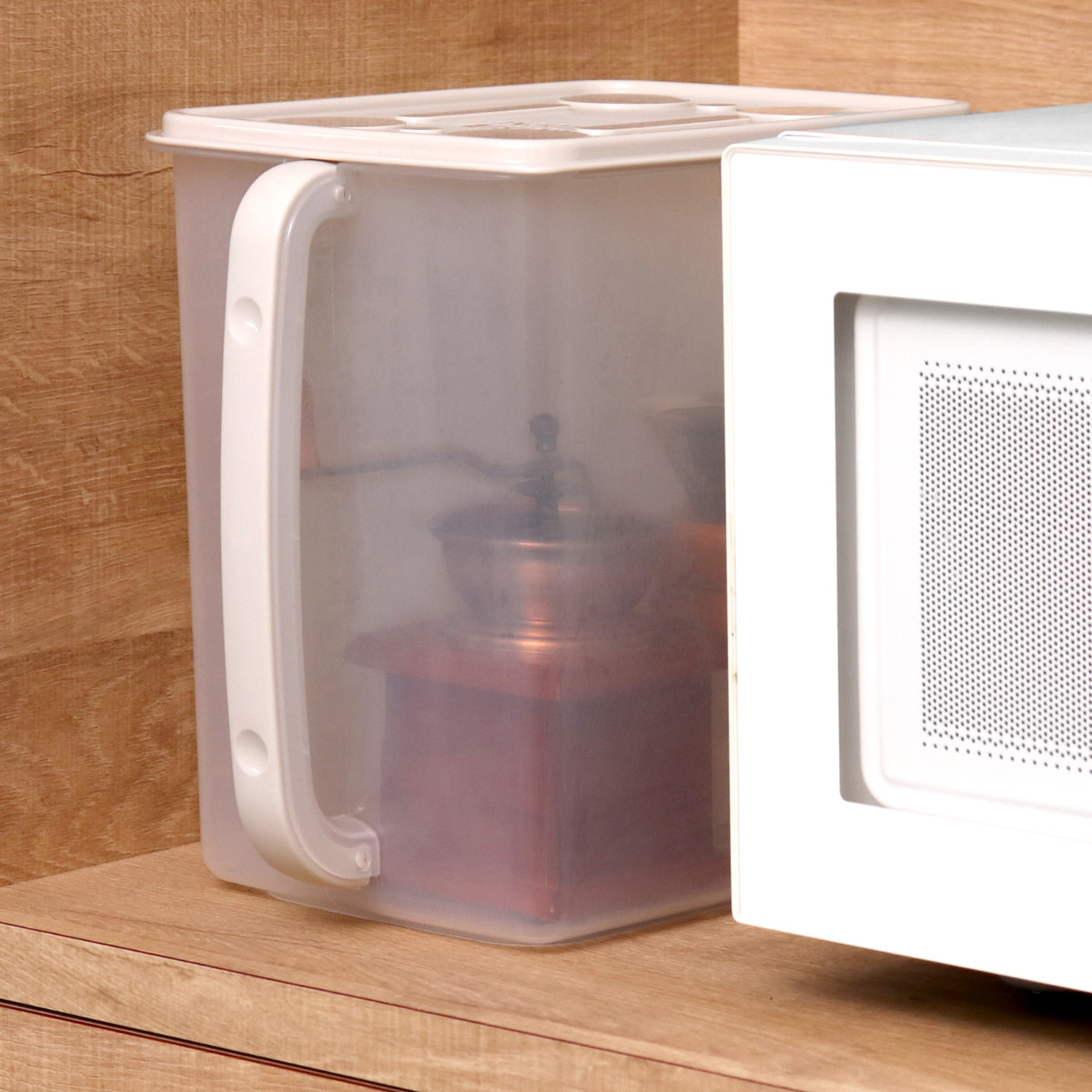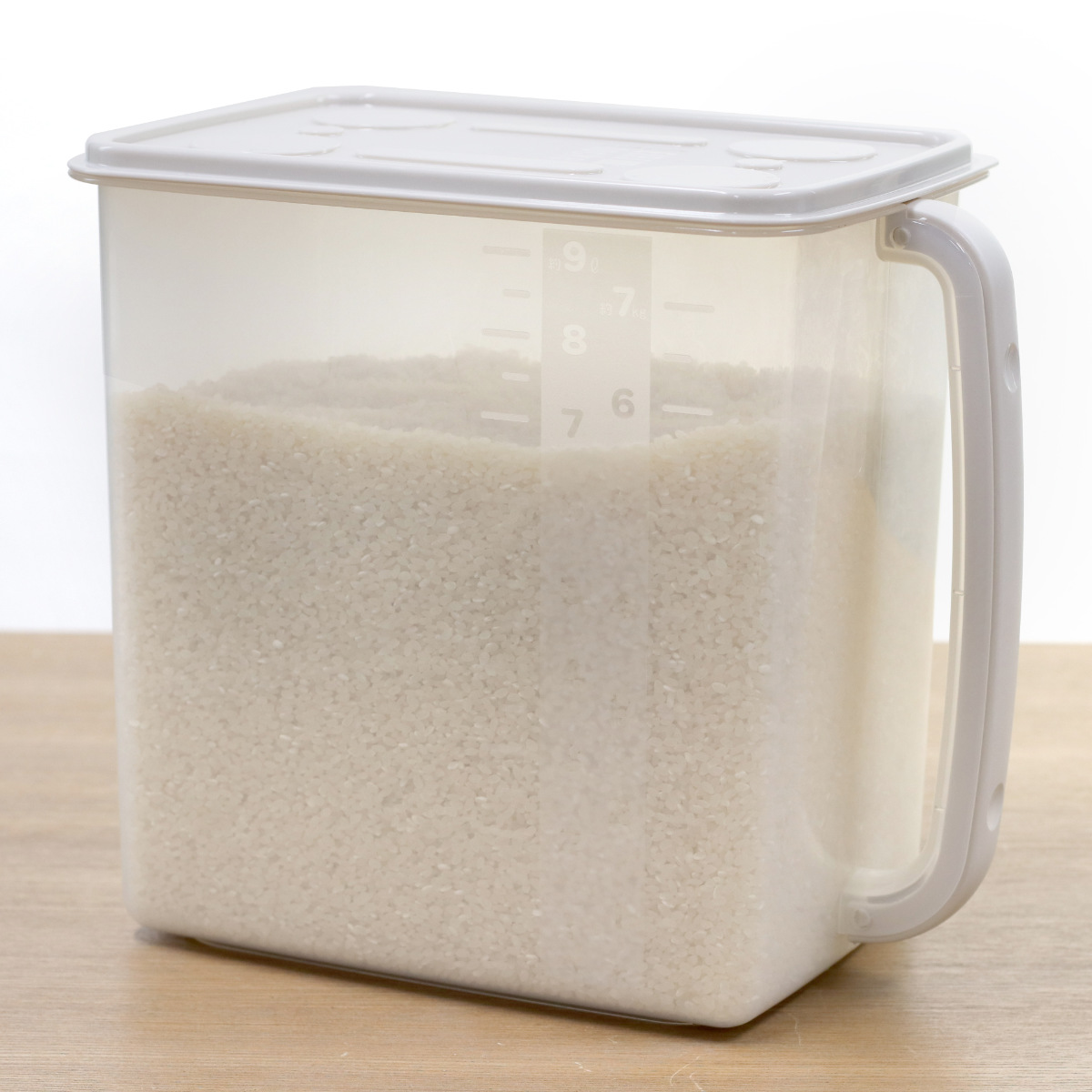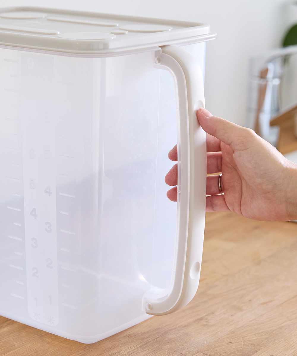 米と水の容量がわかる目盛りが付いています。虫やホコリの侵入を防ぐフタ付きなので、乾物などの保存にもぴったりです。