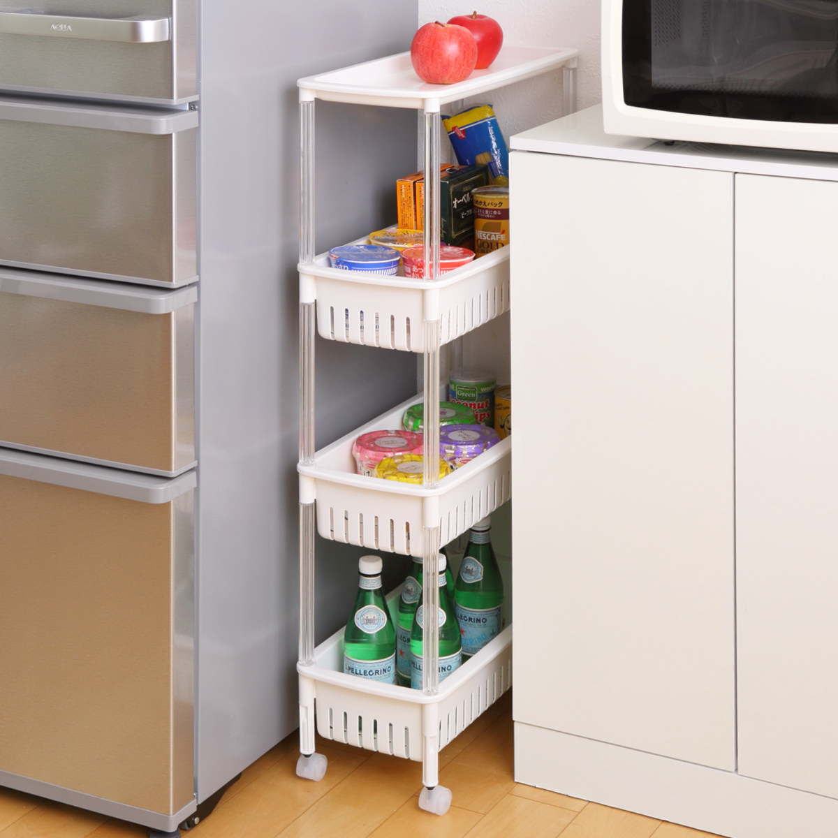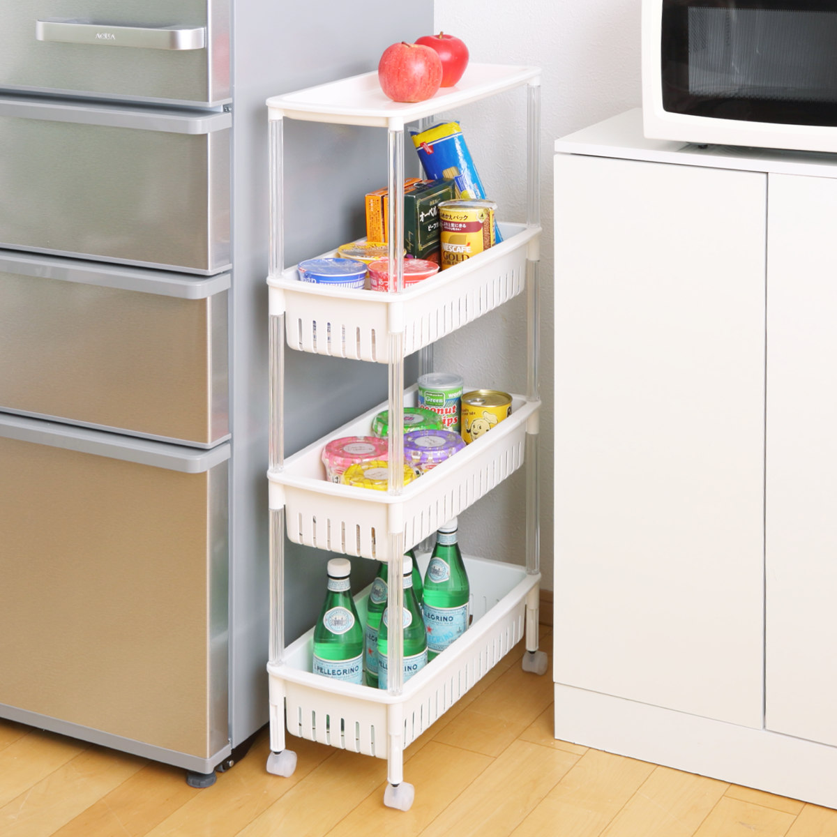 調味料や乾物のストックにちょうど良いオープンタイプのキッチンワゴンです。幅22cmとスリム設計なので、ちょっとしたすき間を収納として有効活用できます。