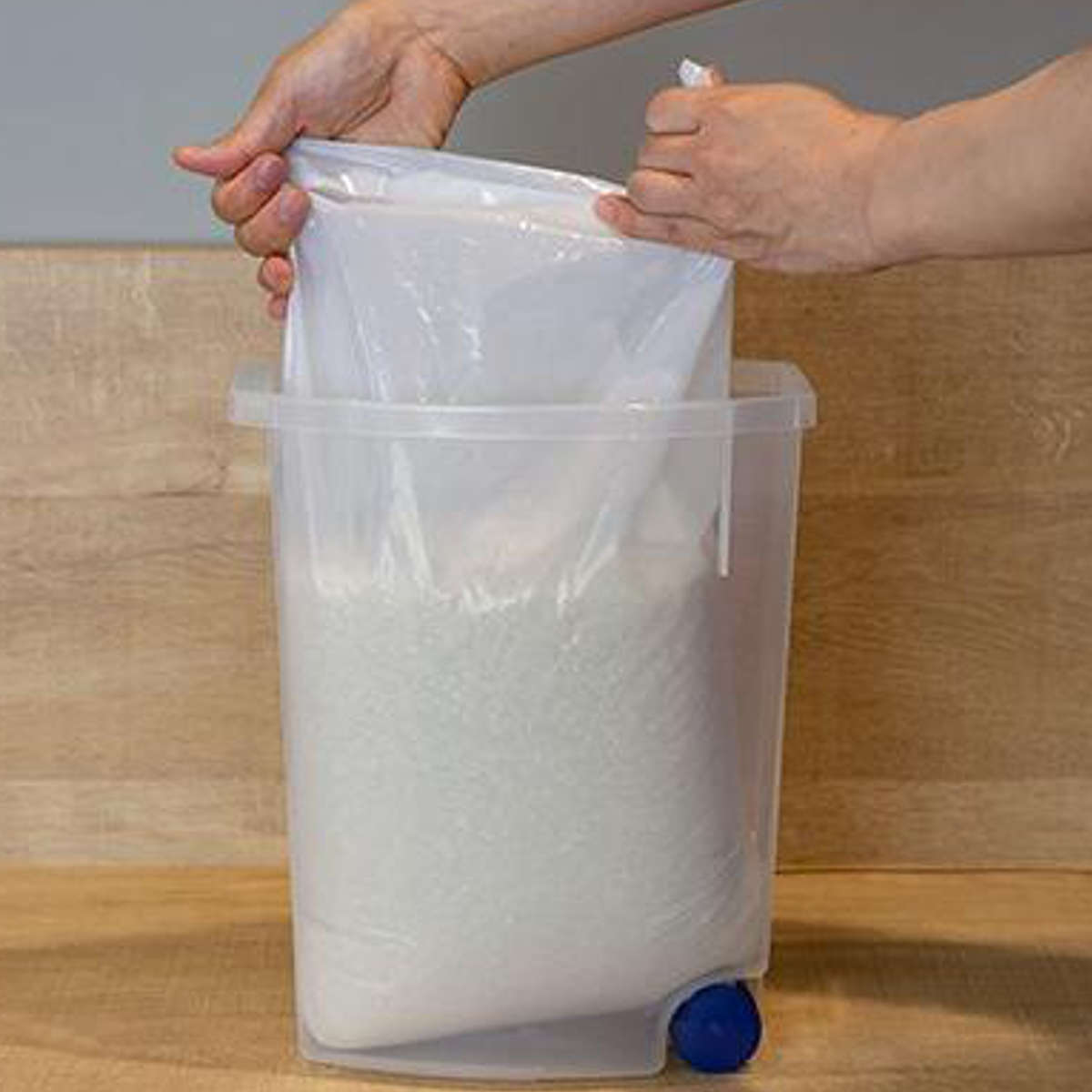 5kgの米袋を縦方向にそのまま収納・保存ができる米びつです。袋のまま収納できるので、移し替える手間が省けます。重いお米を米びつへ移し替える面倒も解決。お手入れもしやすいです。