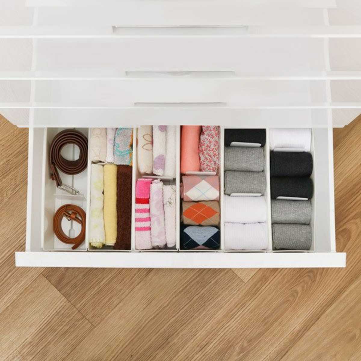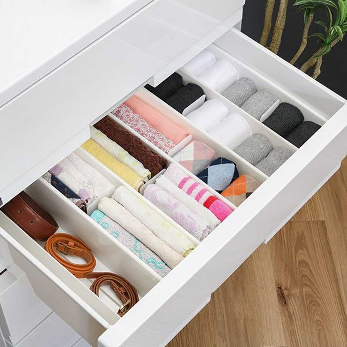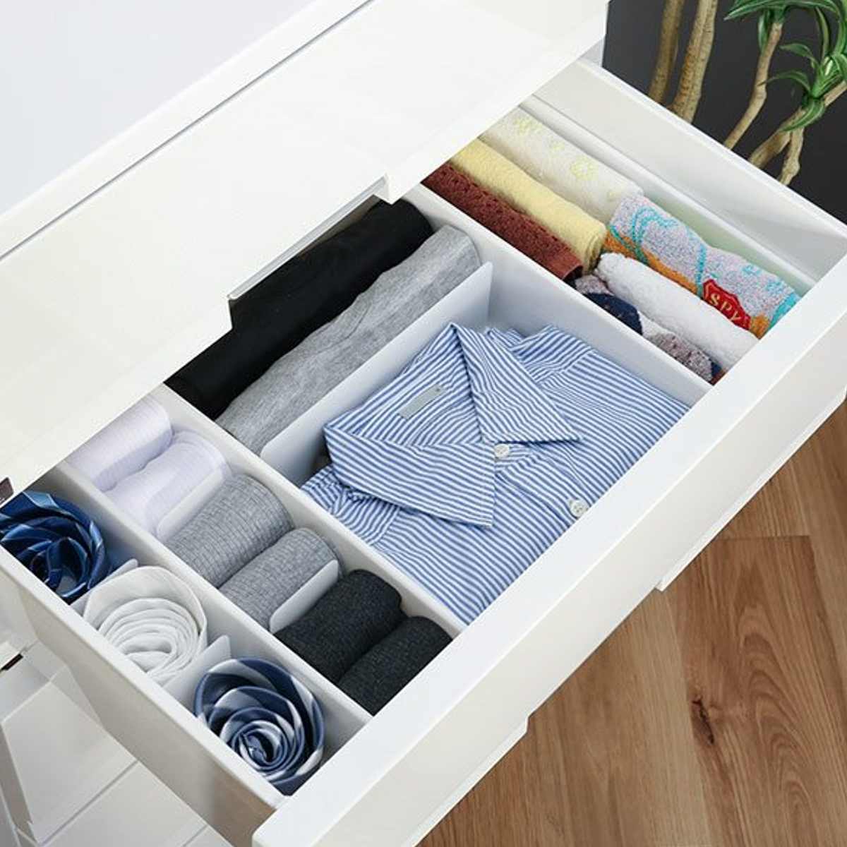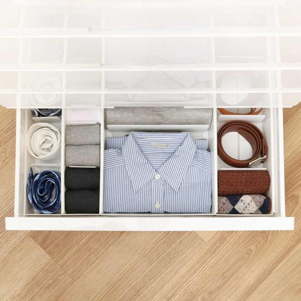 散らかりがちな引き出し内をキレイに整理整頓できる仕切りボックス5個セットです。靴下やネクタイ、ベルト、ハンカチ、ショーツ等の収納に最適で、サッと取り出せて便利です。付属の仕切り板は可動するので、収納物のサイズに合わせて調節ができ、きちんと立たせて型崩れを防ぎます。