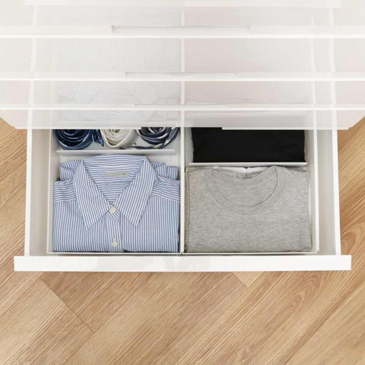 収納チェスト「フィッツプラス プレミアム」の引き出しに、こちらの仕切りケースを組み合わせれば、引き出し内が隙間なくピッタリフィットします。無駄なく、見た目もキレイに収納したい方にオススメの組み合わせです。