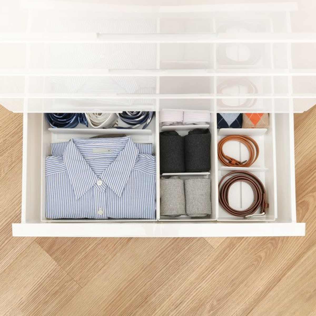 仕切りケースは、【靴下用】【ランジェリー用】【Tシャツ用】それぞれのサイズの奥行、高さが一緒です。同サイズや別サイズと組み合わせて使えば、さらにすっきりまとめて収納ができます。引き出しサイズに合わせて組み合わせは自由自在で、自分好みの収納スペースを作ることができます。また、ケース同士はズレないように連結も可能です。