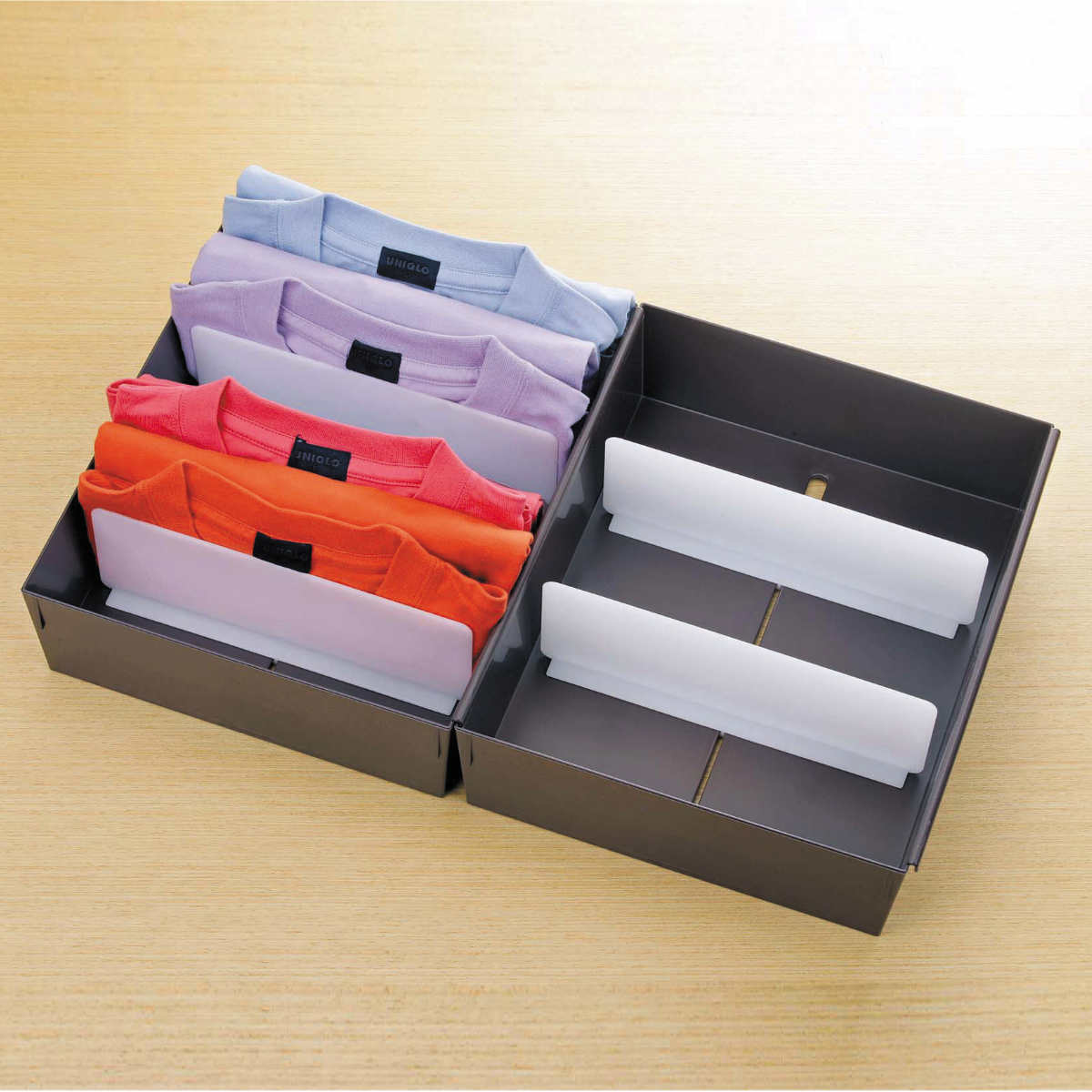 ●付属の仕切り板は可動するので、収納物をキチンと立たせて型崩れを防ぎます。