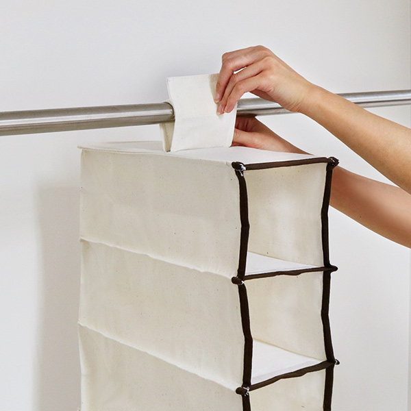不織布でできたスモールラックは、約15cm程のわずかな隙間に吊り下げることができます。ハンガーポールに巻き付けて、面ファスナーで止めるだけの簡単取り付け!クローゼットの空いている空間を、無駄なく快適な収納空間へ生まれ変わらせることができます。