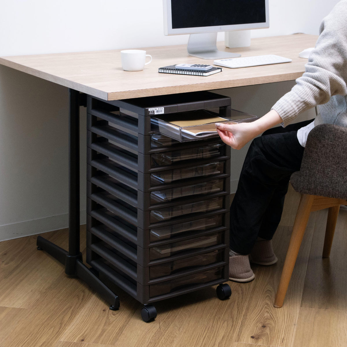引き出しはB4サイズの浅型で、書類やファイルの収納に便利なサイズです。引き出しやすい取っ手付きで開けやすく、ストッパーが付いているので、引き出し過ぎて抜けてしまう心配がありません。外したい時は、強く引くか、引き出しの側面を少し内側にたまわせることで簡単に外すことができます。クリアブラウンカラーで透けて見えるので、引出しを開けなくても中身が確認しやすくなっています。
