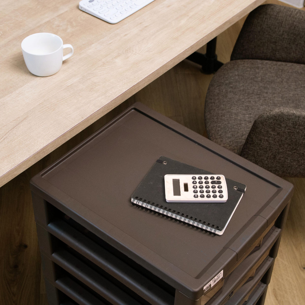 天板部分には深さ5mm程度のくぼみがあるので、スティックのりや印鑑などの転がりやすい小物を置いても落下しません。電話や電卓、軽量のインテリアなどを置いて使えます。
