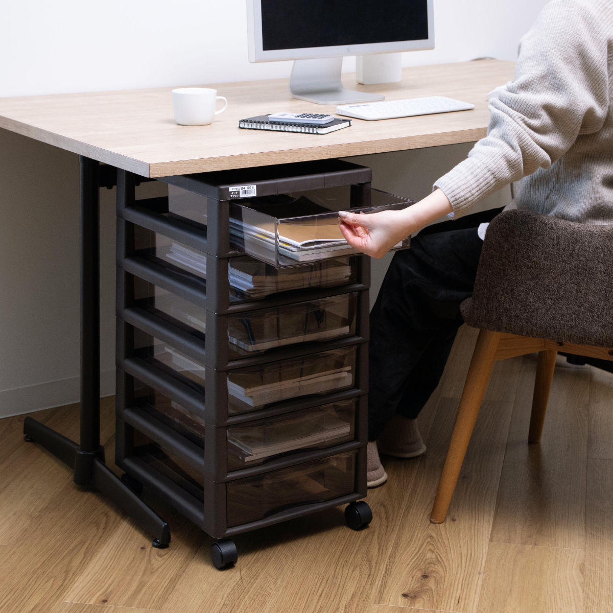 引き出しはB4サイズの深型で、書類やファイルの収納に便利なサイズです。引き出しやすい取っ手付きで開けやすく、ストッパーが付いているので、引き出し過ぎて抜けてしまう心配がありません。外したい時は、強く引くか、引き出しの側面を少し内側にたまわせることで簡単に外すことができます。クリアブラウンカラーで透けて見えるので、引出しを開けなくても中身が確認しやすくなっています。