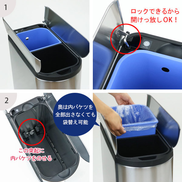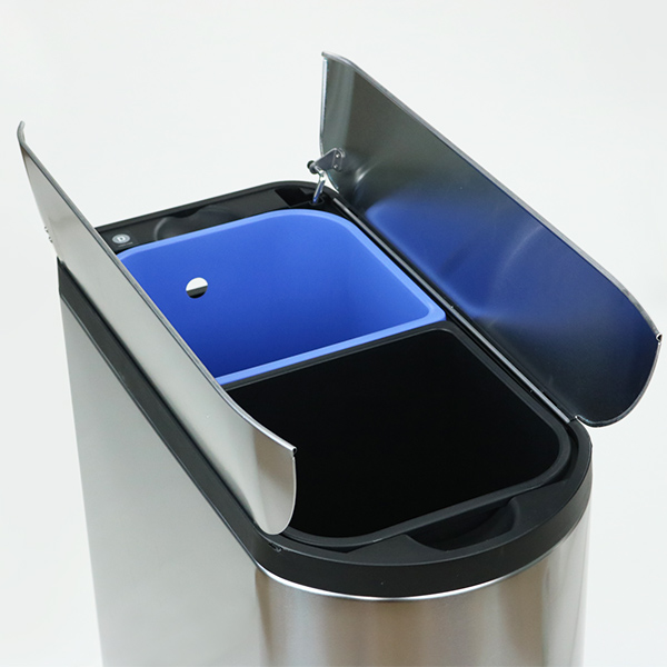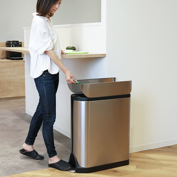 ペダルは、150万回(1日20回×20年間)のステップにも耐えるよう設計され、すぐに壊れる心配がありません。手が汚れたり、ふさがっているときも、ペダルを踏むだけでスムーズにゴミ捨てができ、直接フタに触れる必要がないので衛生的に使えます。20Lの内バケツ2個で手前と奥に区切られているので、簡単にゴミの分別ができます。