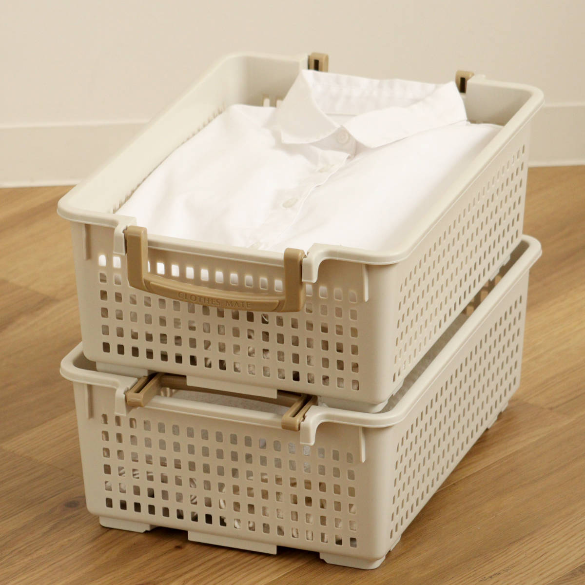 取っ手を内側に倒すと、底にある溝とぴったりフィットして積み重ねることができるバスケットです。積み重ねて使用することで、広いスペースの取れないクローゼットや押入れ、リビングの片隅などで省スペースに整理整頓していただけます。