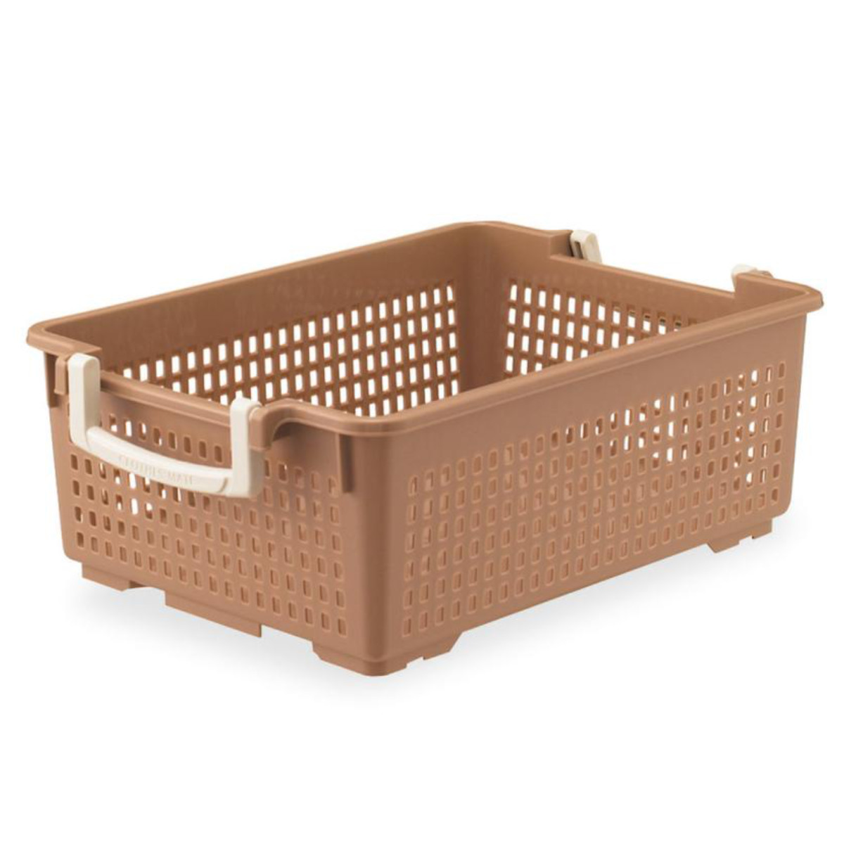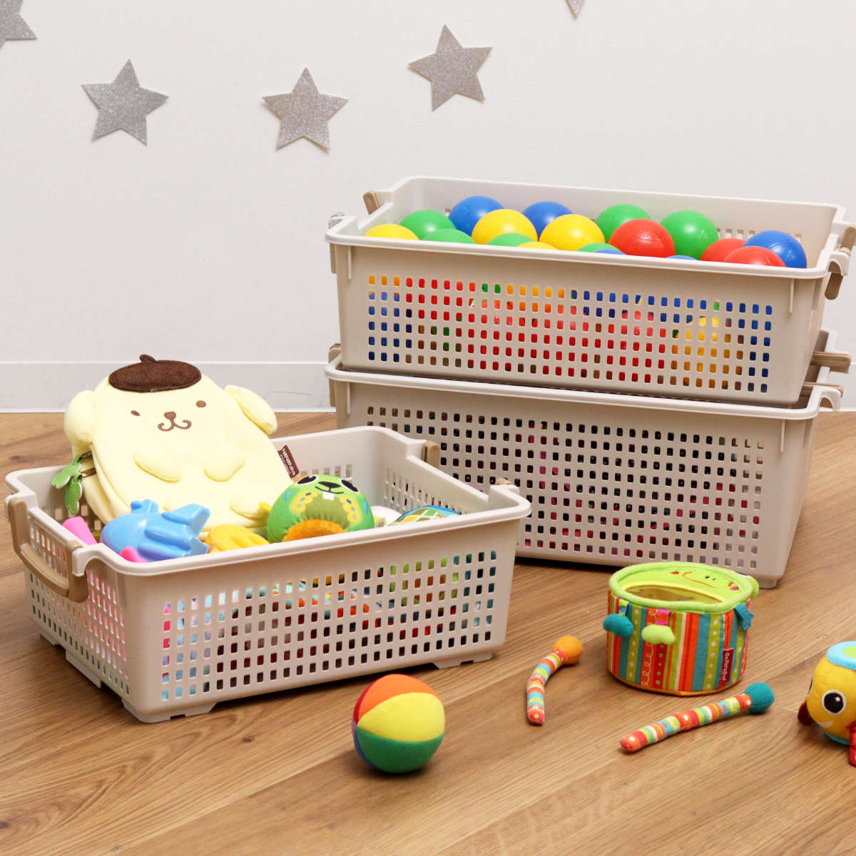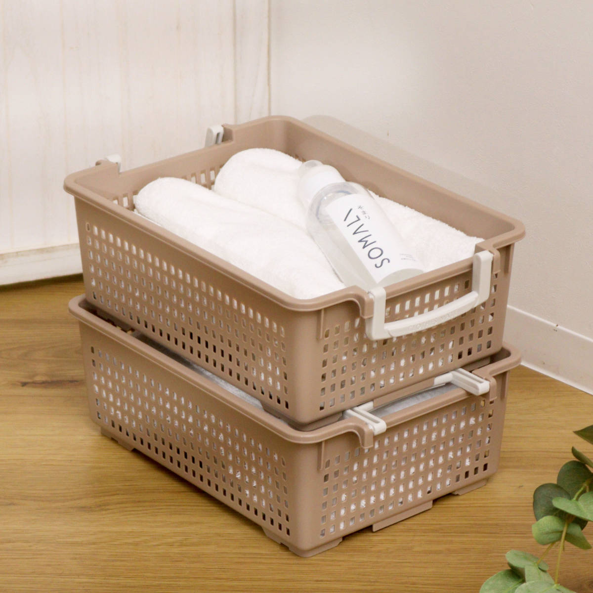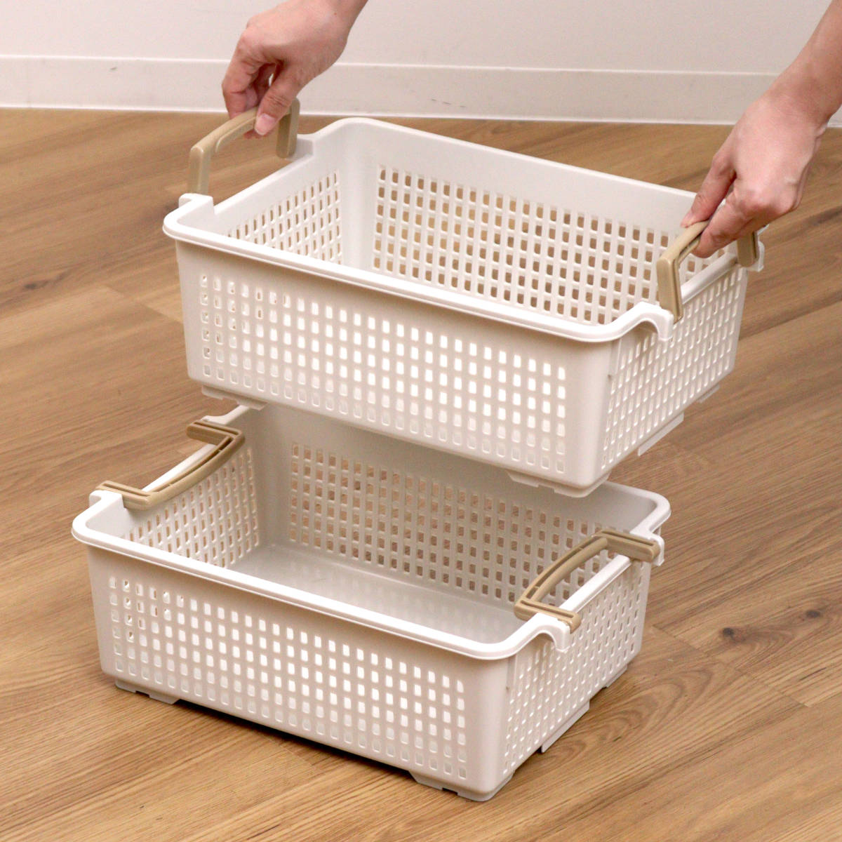 一つでも積み重ねて使ってもどこでも便利に使えるバスケット。キッチンでは食品ストック置き場に、ランドリーや洗面所ではタオルや洗剤の収納、棚の中のインナーケースとしてもお使いいただけます。散らかりがちな、小物やおもちゃや子供用品などの整理整頓に活躍します。