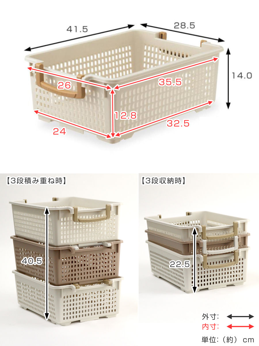 縦と横を違えて重ねる際も、上段のバスケット底の凹部分に下段のバスケットの縁を合わせることでズレ落ちを防止し、しっかりと積み重ねることができます。