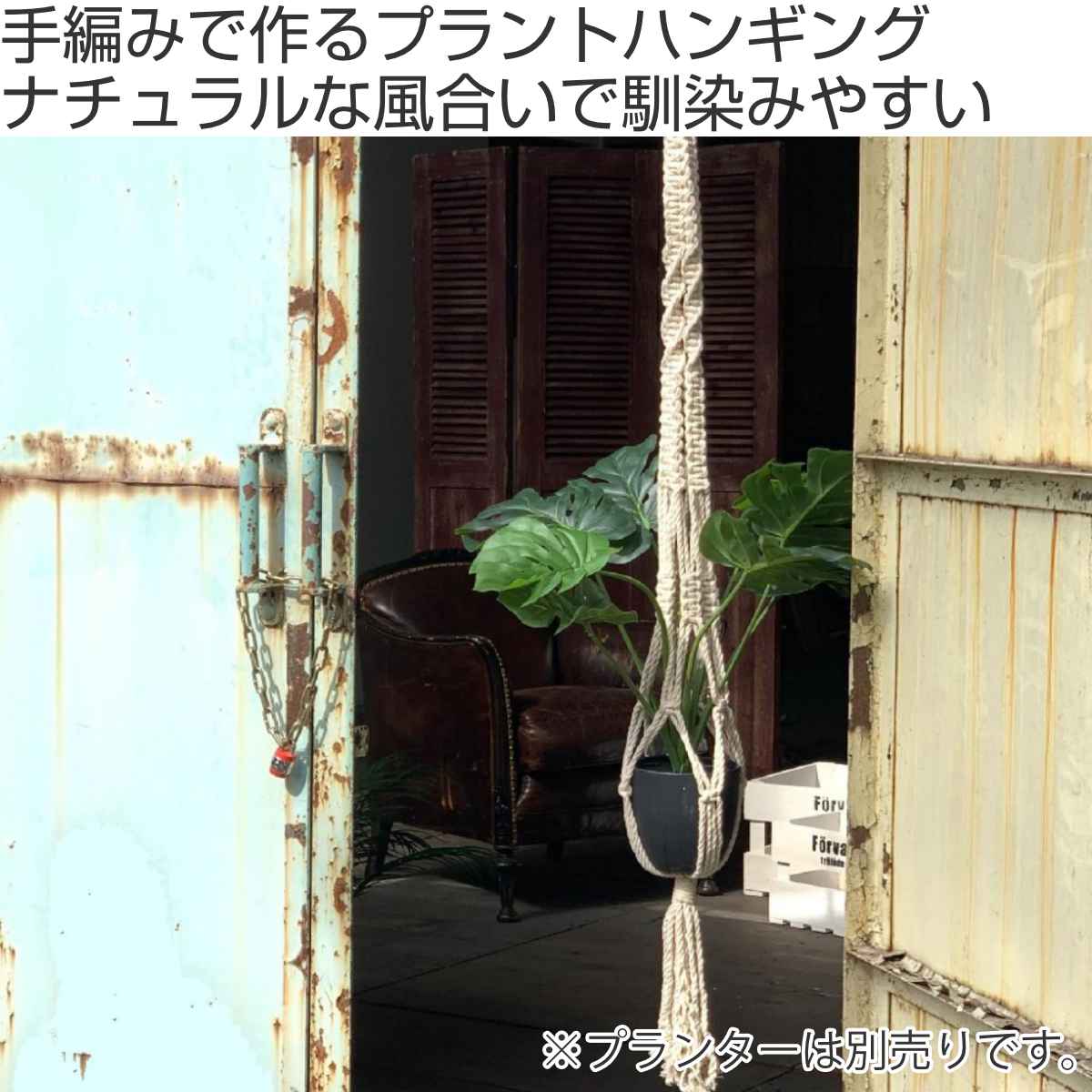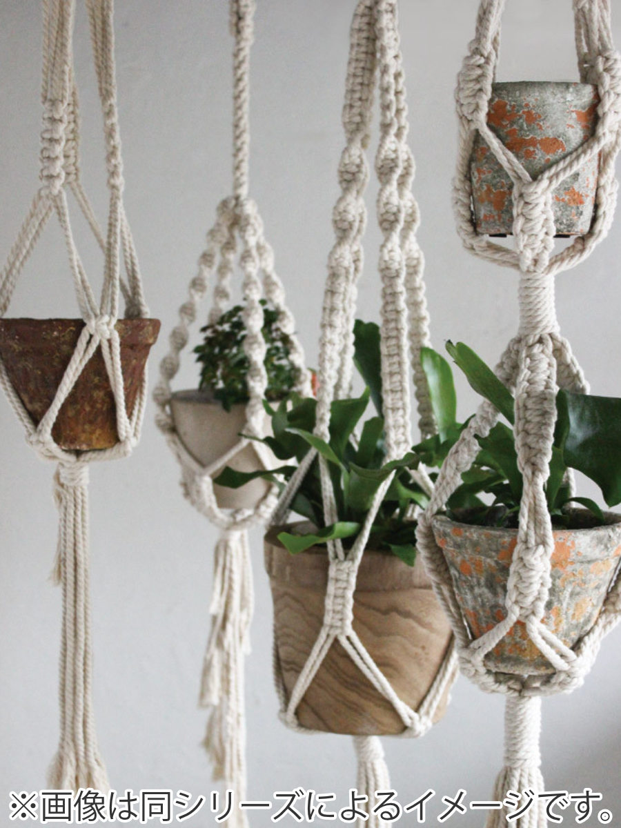 マクラメという結い技法を用いて作られたプラントハンギングです。ひとつひとつ手編みで作るため、紐の長さや編み具合も微妙に違い素材の表情や形に個体差があります。コットン素材なのでどんなインテリアにも馴染みます。プランターの他にもガラスベースやカゴ等を入れて吊るしたり掛けたりとグリーンのある生活を楽しめます。
