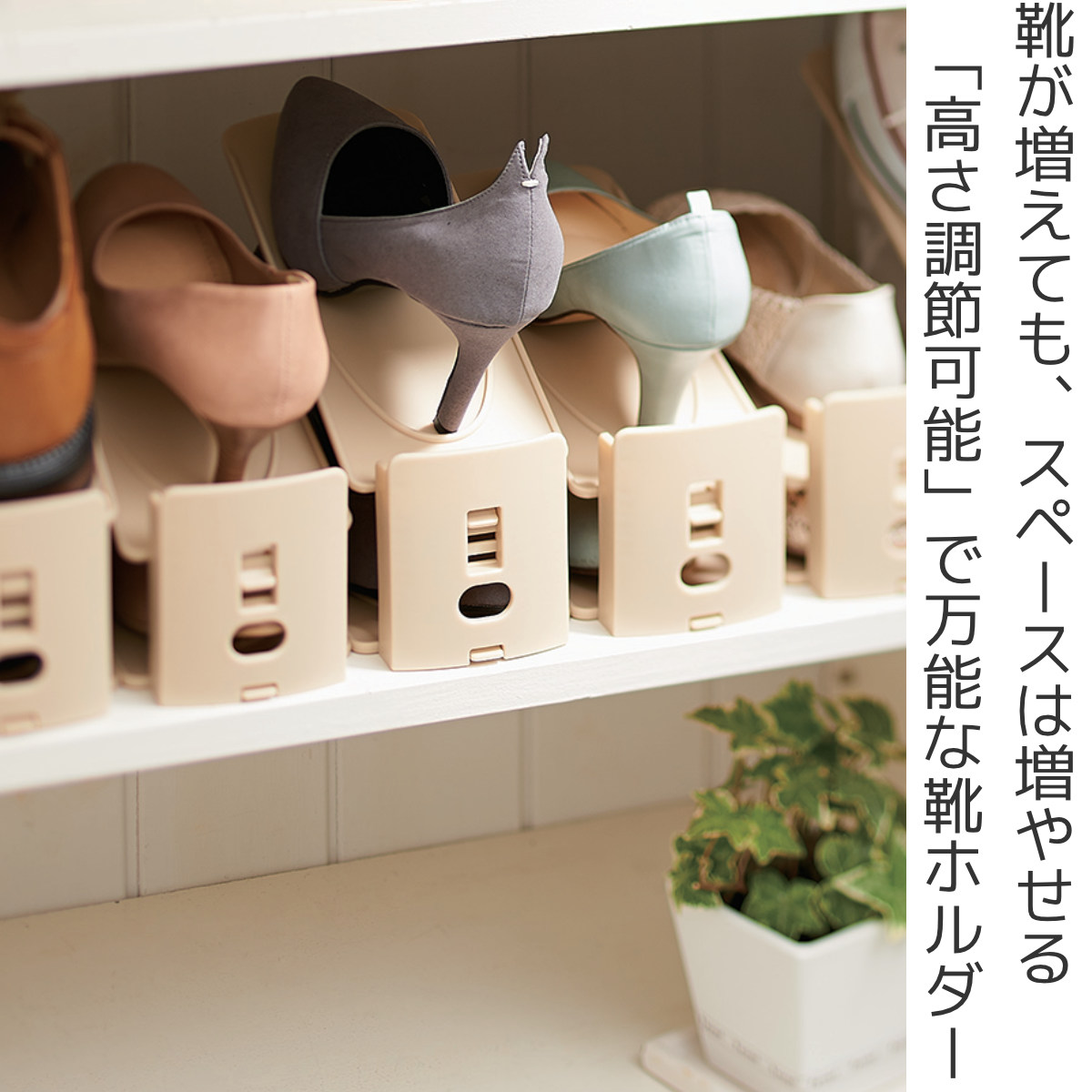 靴の収納量を2倍に増やすことができる、くつホルダーです。1足分のスペースに2足を収納できるため、下駄箱や玄関のスペースを有効活用できます。「靴が多くて下駄箱に入りきらない!」「玄関にたくさんの靴を出しっぱなしにしている」という方にオススメです。
