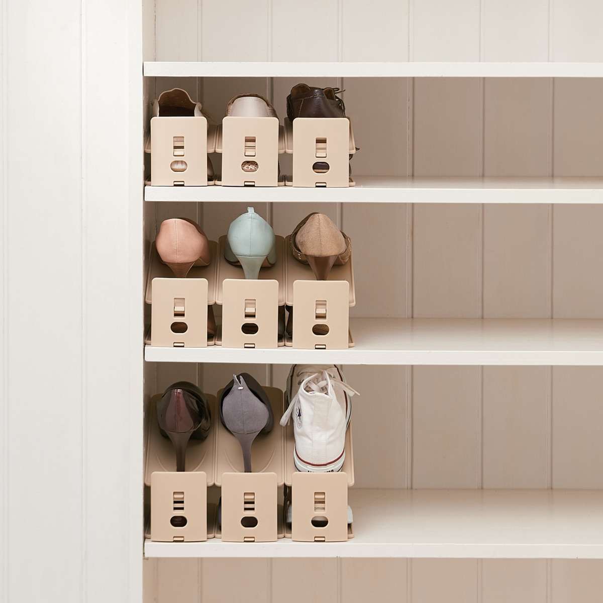 高さは、約10cm~18cmの3段階で調整できます。トレーを差し替えるだけのシンプルな構造です。ぺたんこ靴からお洒落なハイヒール、ハイカットのスニーカーまで様々な高さの靴を無理なく収納できます。