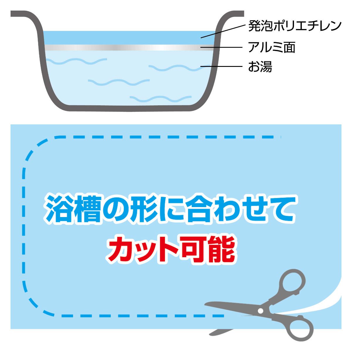 浴槽に直接浮かべるだけで、お風呂のお湯が冷めてしまうのを防ぐ保温シートです。アルミと発泡ポリエチレンの二重構造でしっかりと温かさを閉じ込めるので、追い炊きの回数を減らすことができて省エネ効果があります。