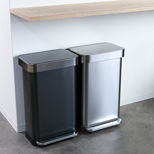 フタをリム(フタのふち)ごと持ち上げて固定できるので、ゴミ袋をラクに取り付けできます。リムを戻すと袋の端が隠れて外から見えず、生活感を出さずにすっきりした外観を保てます。壁やカウンターに沿ってぴったり設置でき、分別用としてカラー違いを並べてもすっきりと空間になじむ、無駄のないシンプルな存在感です。