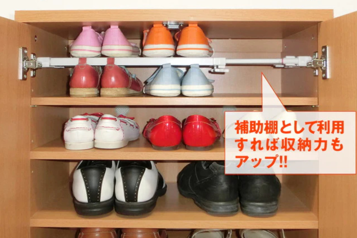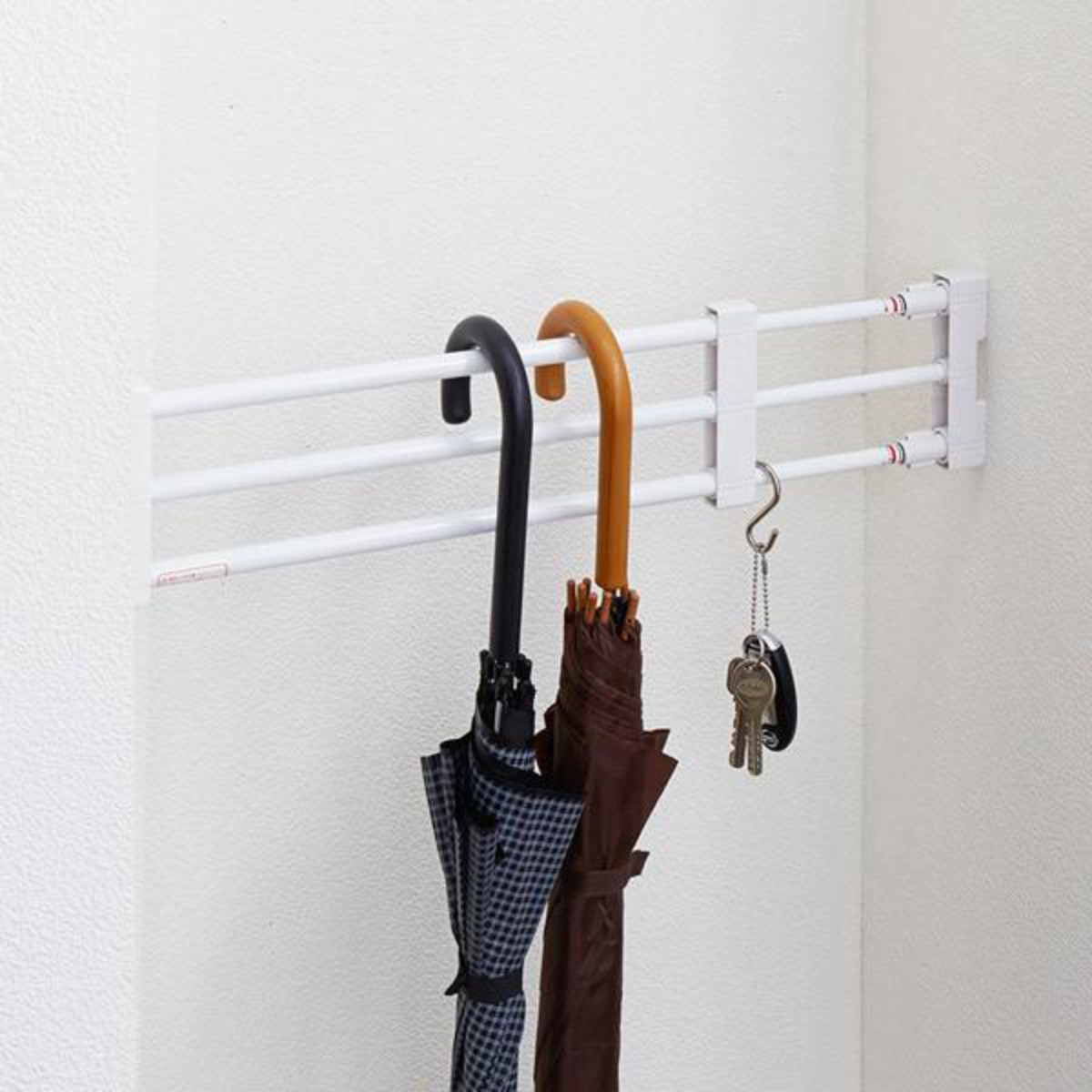 ネジ・クギを使わずに設置することができるつっぱり式の伸縮棚です。トイレや洗面所のデッドスペースに設置して小物を置いたり、下駄箱などで補助棚として設置してスペースを有効活用できます。縦向きに設置して傘かけとしても使用できます。