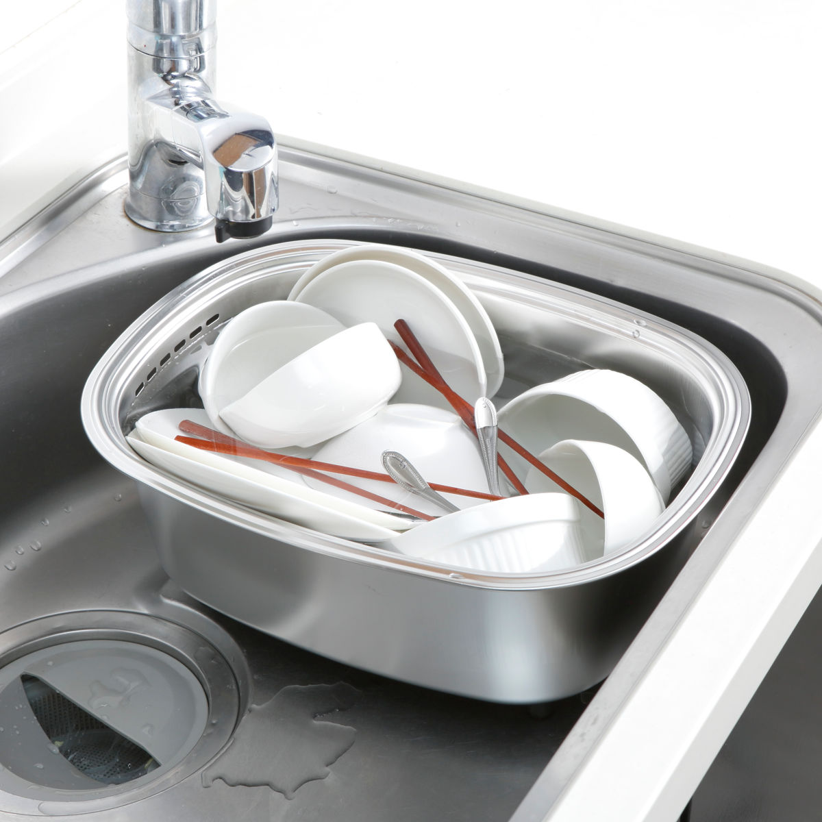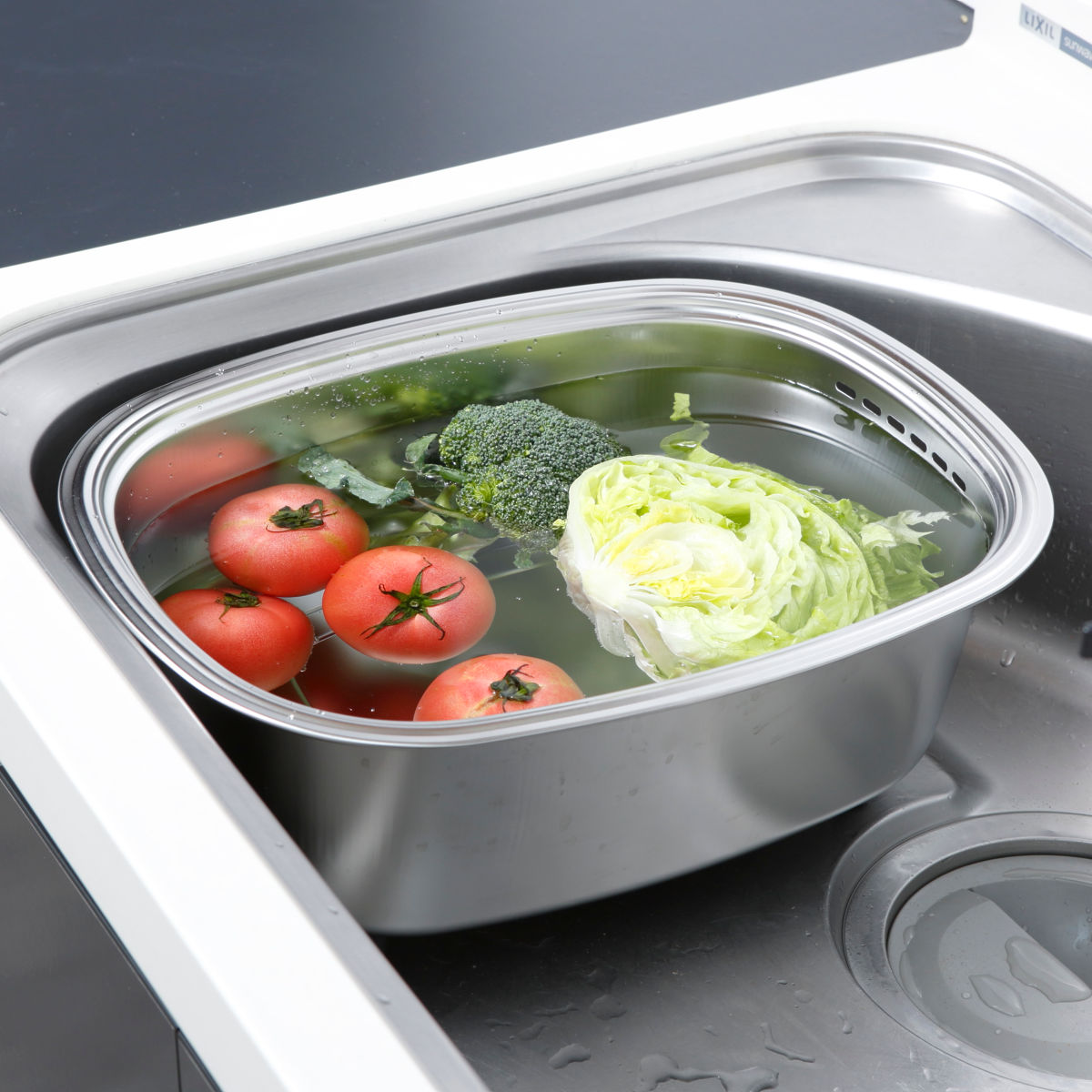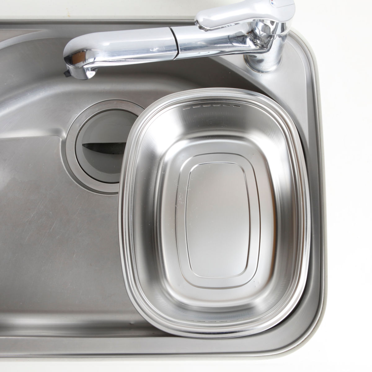 耐久性抜群のステンレス製洗い桶です。サビに強く丈夫なので、毎日の食器洗いにも安心してお使いいただけます。