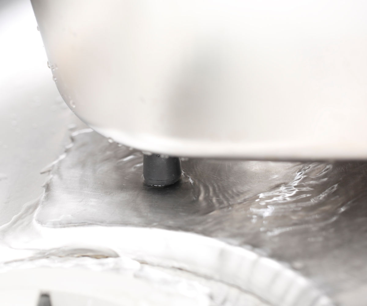 洗い桶の下に約2.3cmのゴム脚が付いているので、桶の底に汚水やゴミが溜まらず、排水口へスムーズに流れます。底が浮いているため、排水口の上に置いても水はけが良く、底面に水垢やぬめりがつきにくいので清潔に使えます。また、洗う面がシンクの底より高くなるので、食器を洗う時に疲れにくいです。