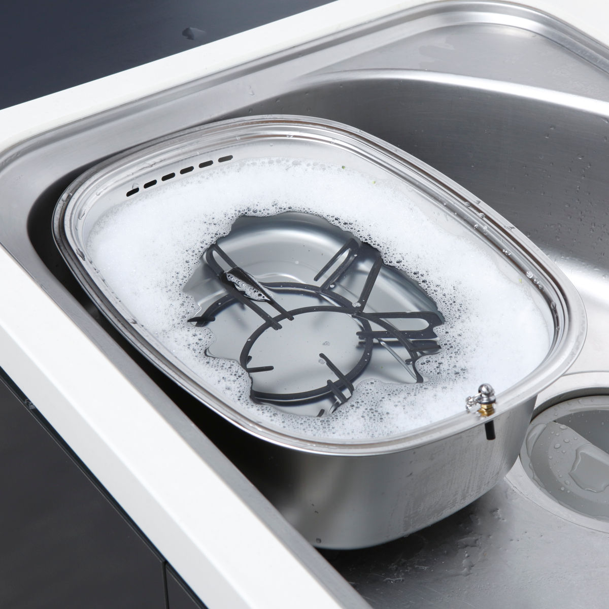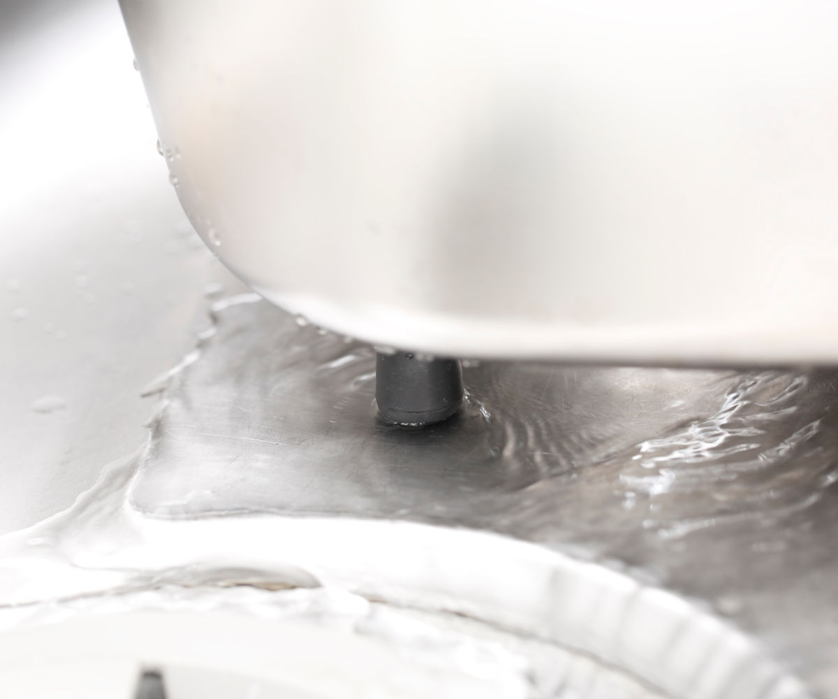 洗い桶の下に約2.3cmのゴム脚が付いているので、桶の底に汚水やゴミが溜まらず、排水口へスムーズに流れます。底が浮いているため、排水口の上に置いても水はけが良く、底面に水垢やぬめりがつきにくいので清潔に使えます。また、洗う面がシンクの底より高くなるので、食器を洗う時に疲れにくいです。