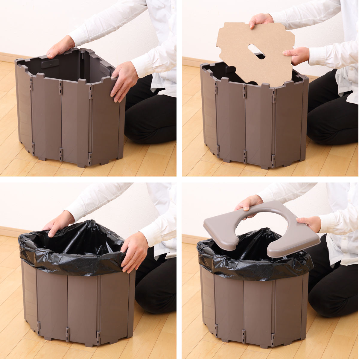 本体を開いて底板で固定し、便座とフタをのせるだけで完成します。凝固剤、汚物袋が10回分セットなので、非常時にすぐにお使いいただけます。