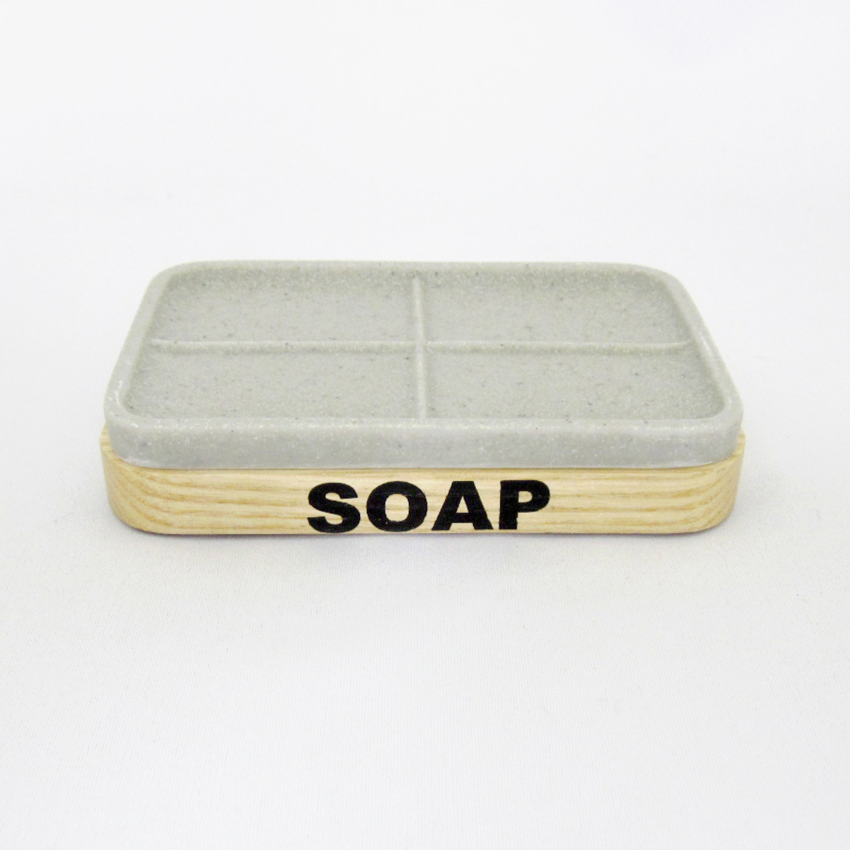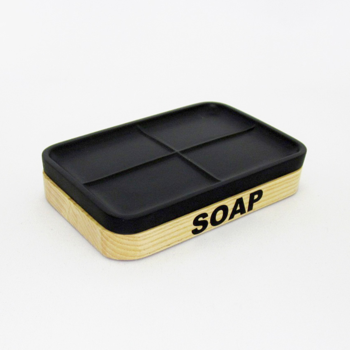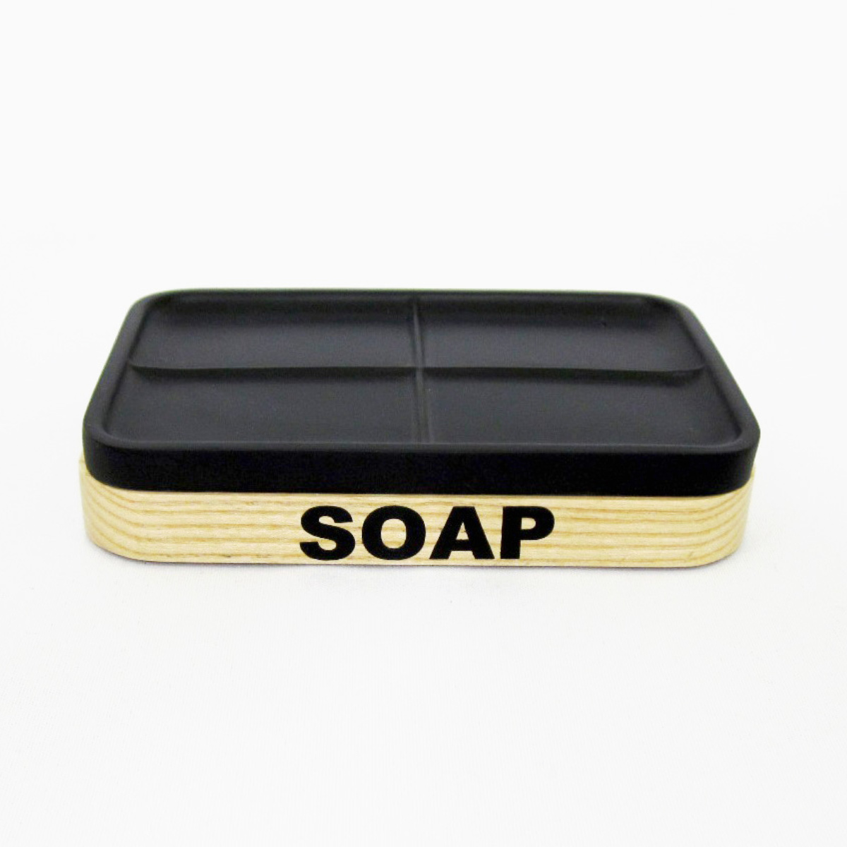 木目に黒字の刻印が目を引く、スタイリッシュなソープディッシュです。シンプルで落ち着いたカラーとフォルムが、洗面台やバスルームに自然に溶け込みます。インテリア性も高く、生活感を抑えた空間づくりにピッタリです。