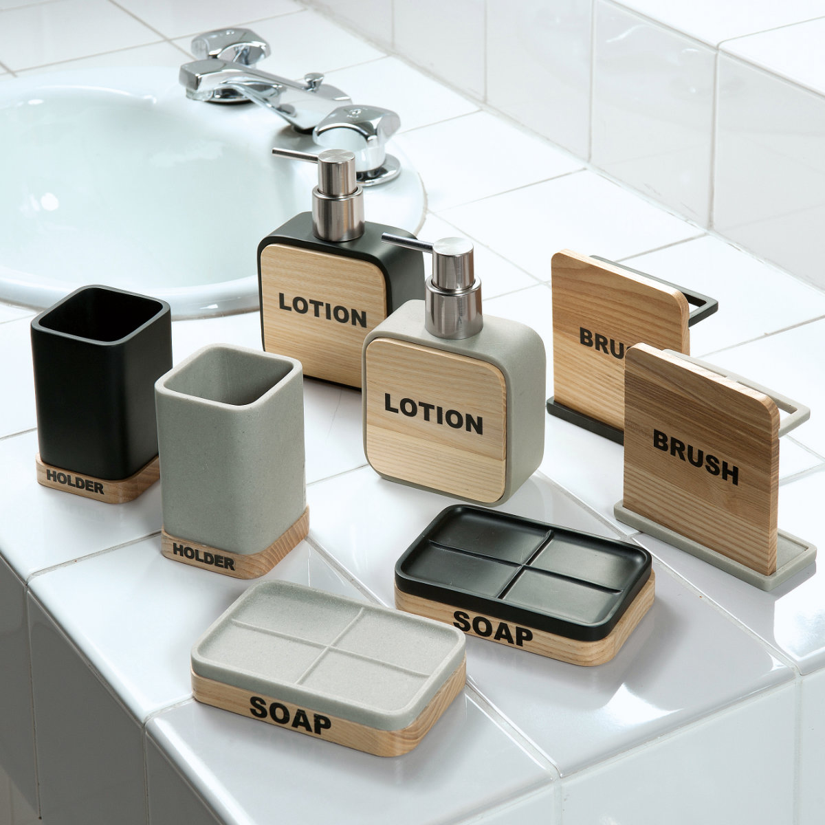 陶器と木目の組み合わせがスタイリッシュなコリーヌシリーズです。同シリーズには、歯ブラシスタンドやソープボトルなどもございます。同シリーズで揃えると、統一感のある洗面空間を演出してくれます。