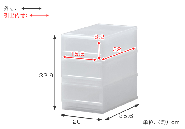 奥行と高さは全サイズ共通で、幅のみ異なるサイズとなっています。