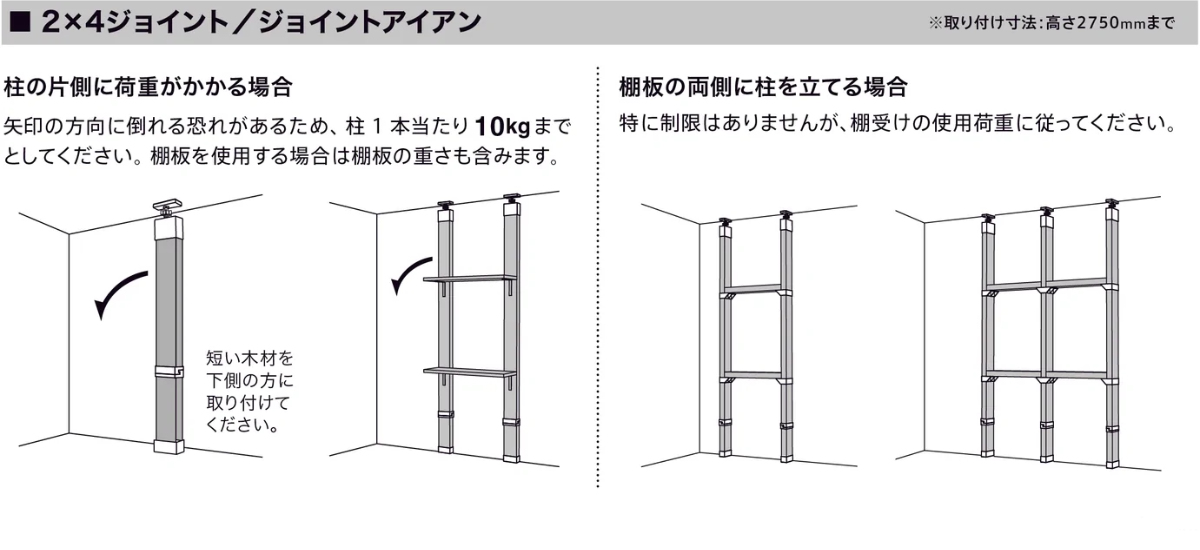| 注意事項 | ※木材は付属しておりません。 ※この商品は縦突っ張り専用です。横向きには使用しないでください。 ※2カ所以上接合しないでください。 ※柱に対し片側に荷重が掛かる場合は、10kgまでとしてください。(棚板を使用する場合は棚板の重さも含みます) |