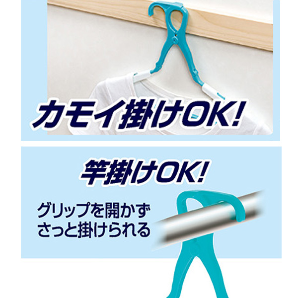 ●グリップが倒れるので、襟首を伸ばさず、スムーズに掛けられることができます。
