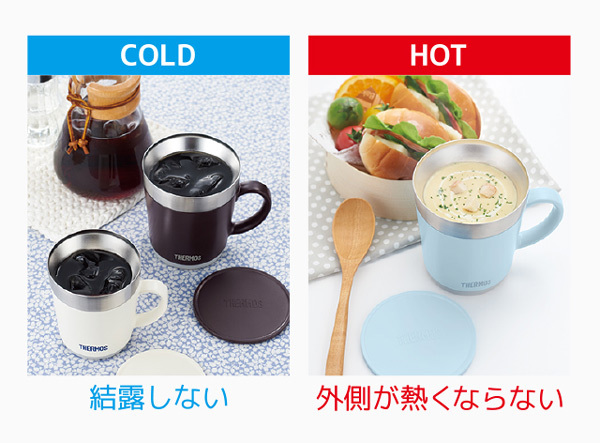●ステンレス製の魔法びん構造の本体と、取っ手付きホルダーの二重構造で温かい飲み物も冷めにくく、外側が熱くなりません。