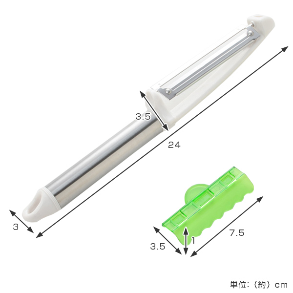 | サイズ | ピーラー本体:約 幅3×奥行24×高さ3.5(cm)重量:約76g 安全ホルダー:約 幅7.5×奥行3.5×高さ1(cm)重量:約12g |