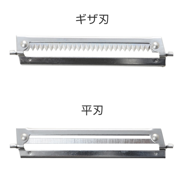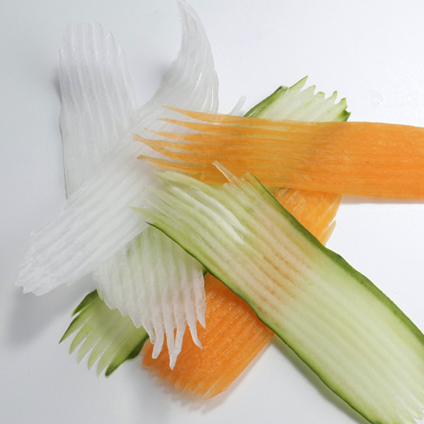 滑らかな切れ味の平刃は、ごぼうのささがき、大根の桂剥き、キュウリやニンジンの輪切りなど多種多様な用途に使えます。極薄約1mmの厚さに食材をスライスでき、軽くのせて削るだけで、キャベツの千切りもふわふわの仕上がりになります。