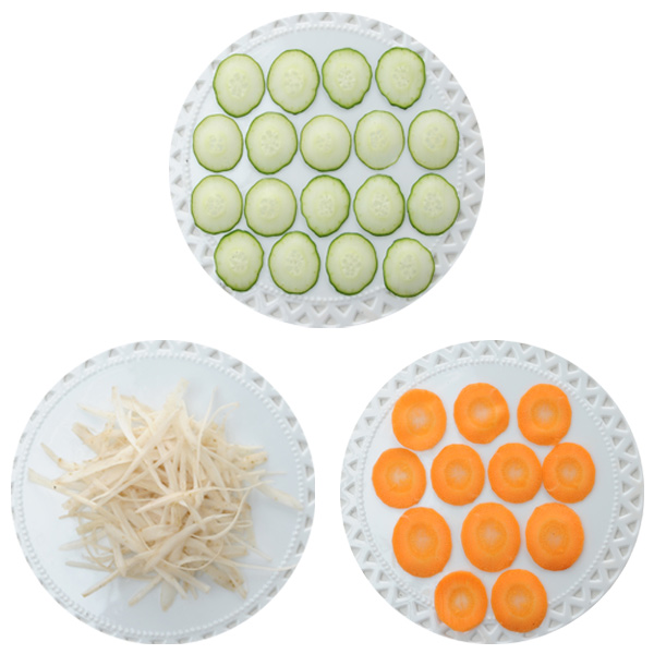 ●Xの字を描くように角度を変えながら野菜をスライスするだけで網目模様が作れます。