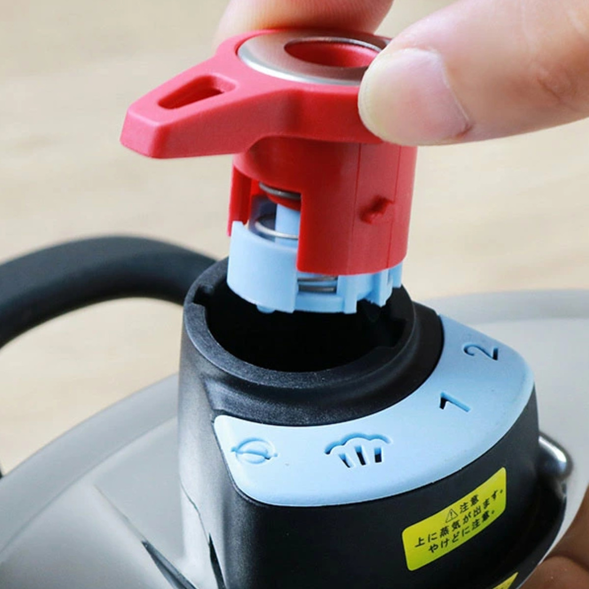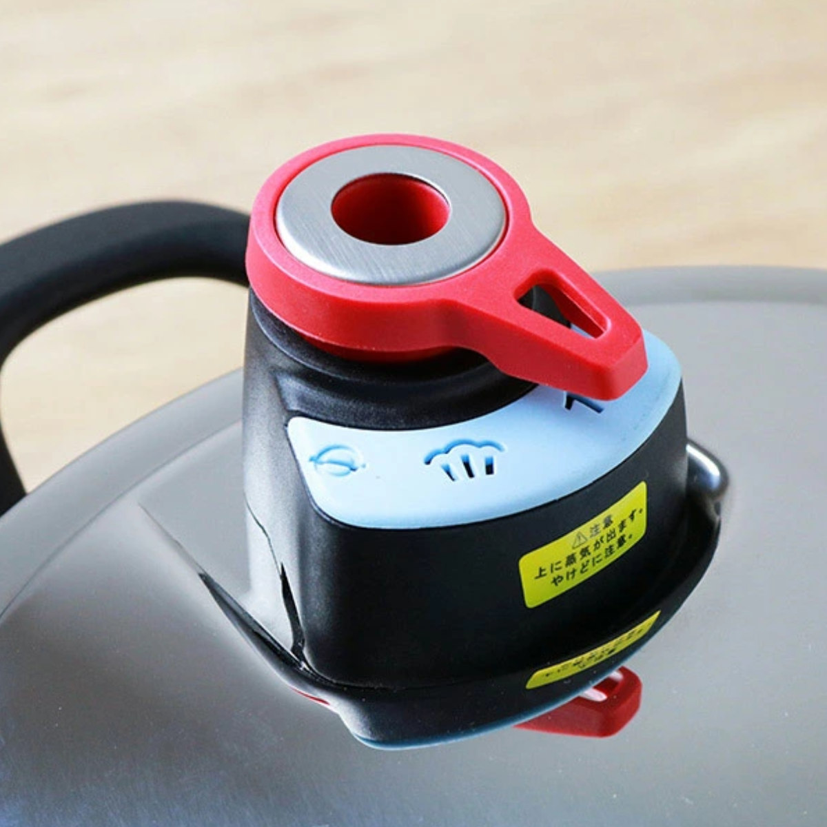 4.時間がきたら火を止め、しばらくしてフロートが下がったのを確認したら、おもりを外してゆっくりと蓋を開けます。