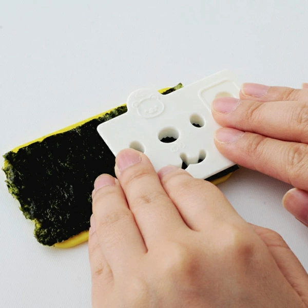 | カッター1枚で2役 カッター右側点線部分は食材用、左側は海苔用です。カッター1枚で使い分けでき、パーツが少ないので収納する際も便利です。 | アレンジ色々♪ ふりかけやでんぶ、めんつゆなどでご飯に味を付けたり、海苔・チーズ・ハムで顔を作ったり、アレンジ自在です。 |
