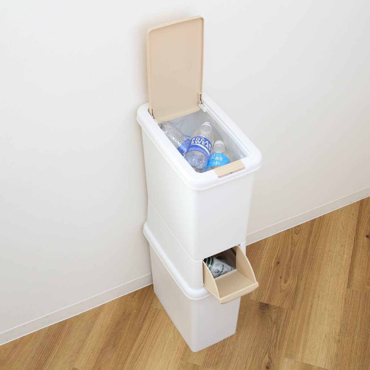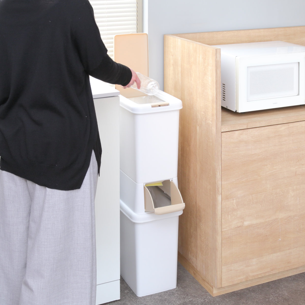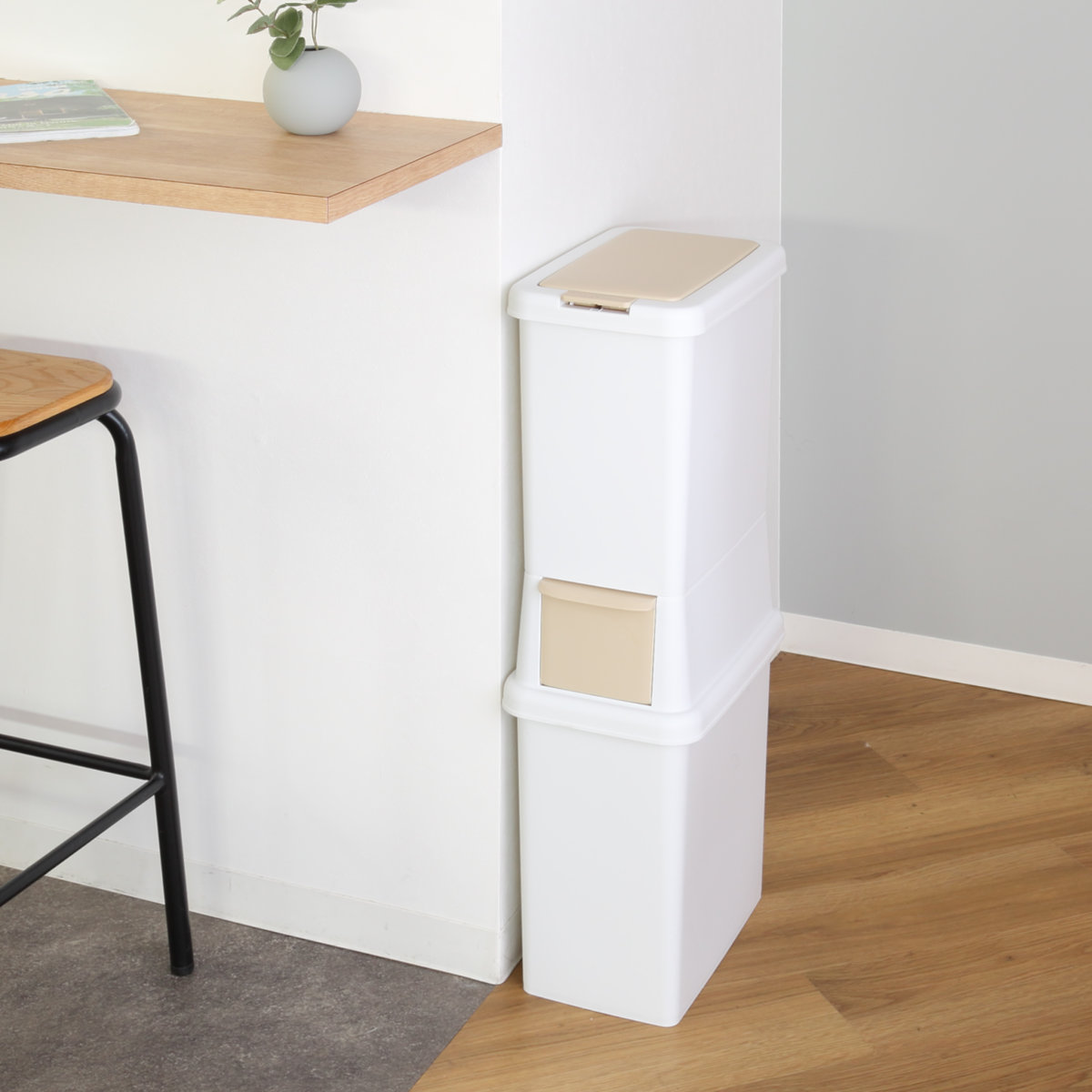 分別に便利な2段式のダストボックスです。上段に21L、下段に20Lの合わせて41Lのゴミが収められます。たっぷりサイズなのにスリムで縦型なので、場所をとらずに設置できます。生ごみや燃えるごみは上段に、空きビンや缶などは下段になど、ご自由に分別できます。