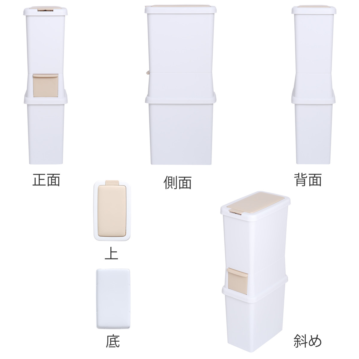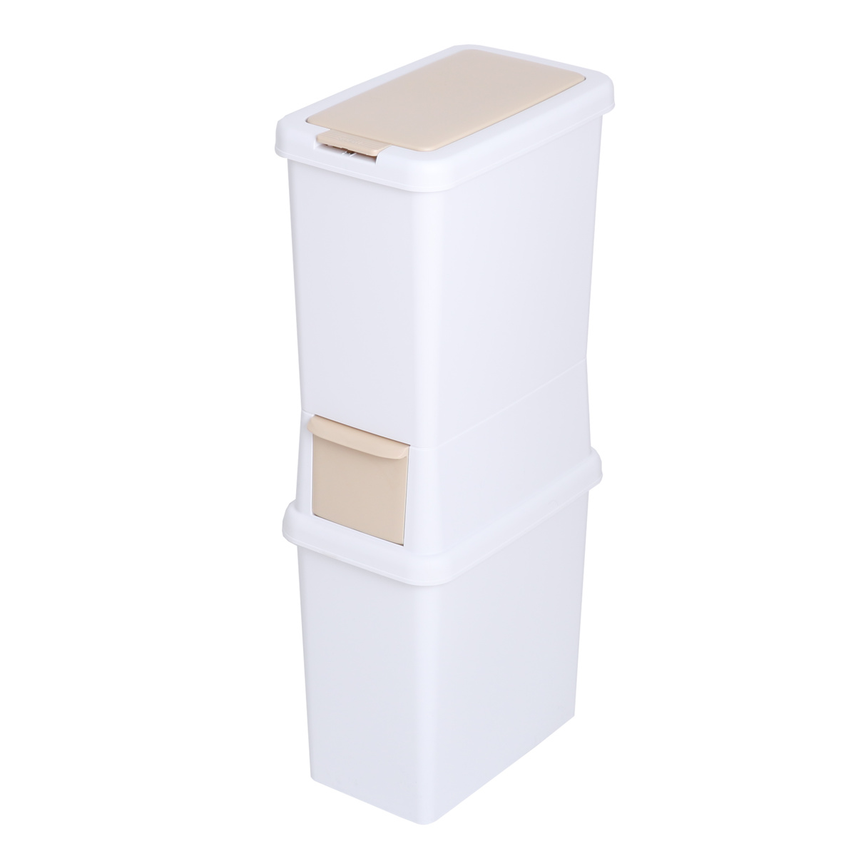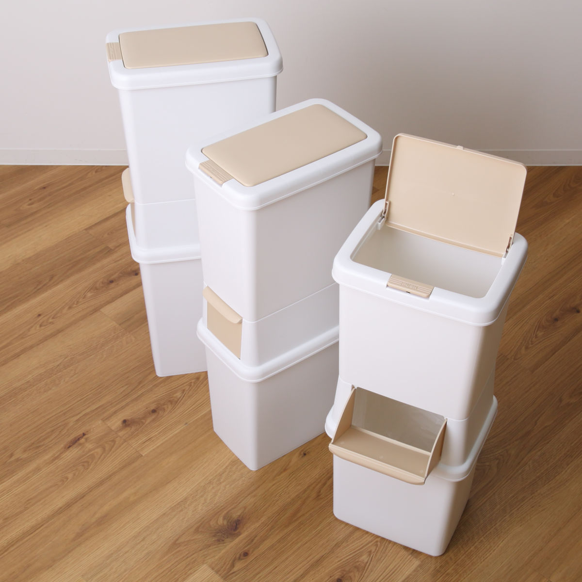 分別に便利な2段式のダストボックスです。上段に21L、下段に20Lの合わせて41Lのゴミが収められます。たっぷりサイズなのにスリムで縦型なので、場所をとらずに設置できます。生ごみや燃えるごみは上段に、空きビンや缶などは下段になど、ご自由に分別できます。