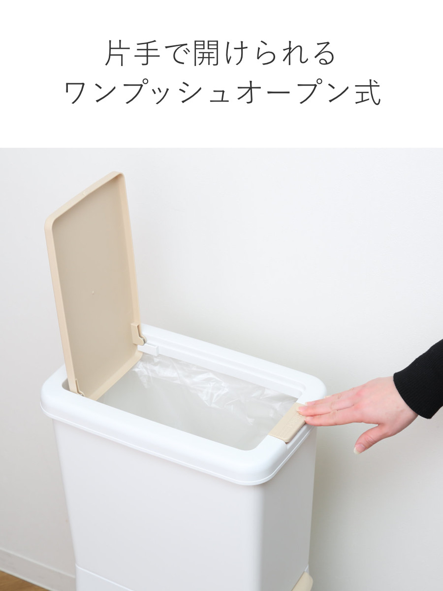 上段はワンプッシュオープン式なので簡単に開け閉めでき、料理中など片手がふさがっている時でもゴミが捨てやすいです。ふたは開いたまま止まるのでたくさんのゴミも入れやすいです。