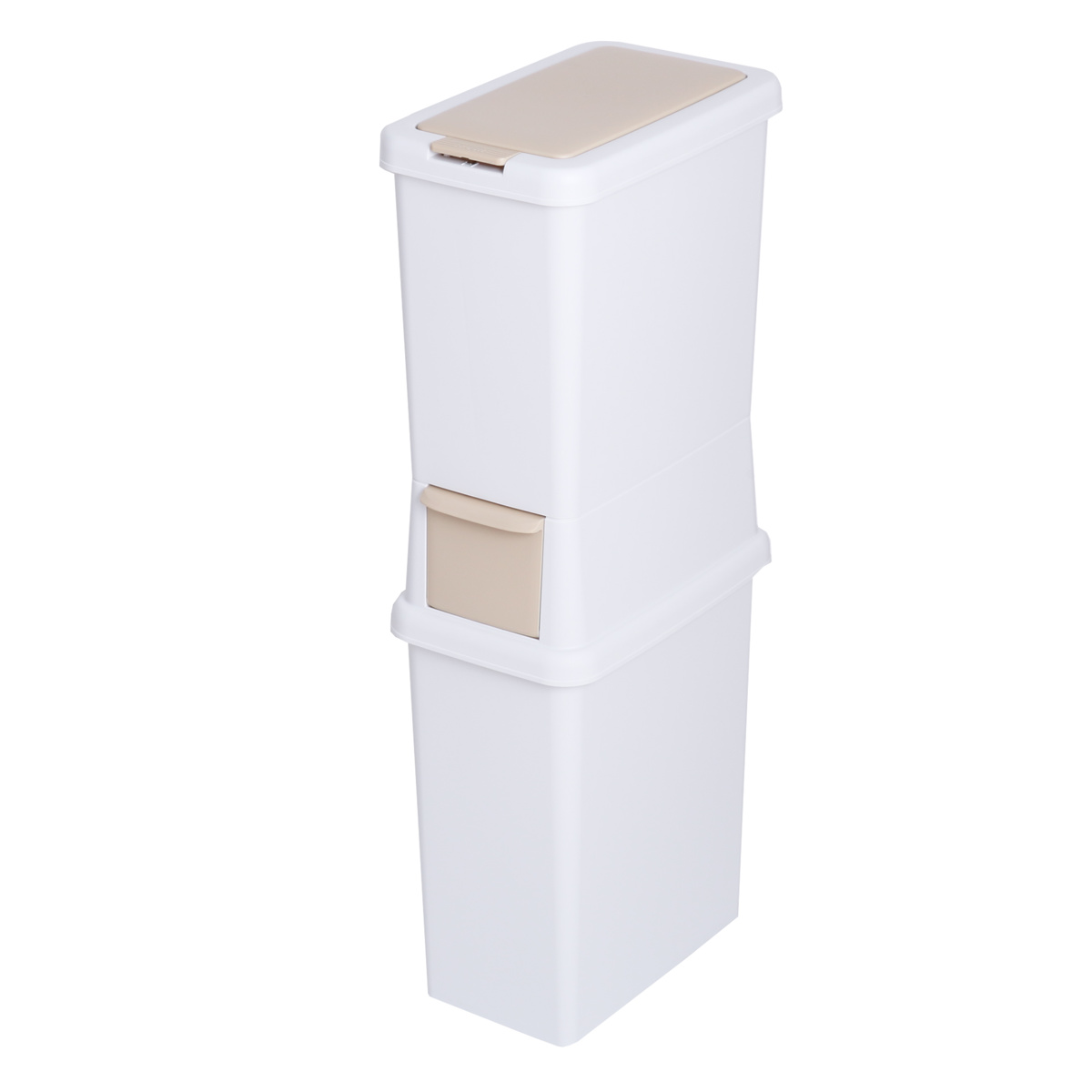 分別に便利な2段式のダストボックスです。上段に21L、下段に26.5Lの合わせて47.5Lのゴミが収められます。たっぷりサイズなのにスリムで縦型なので、場所をとらずに設置できます。生ごみや燃えるごみは上段に、空きビンや缶などは下段になど、ご自由に分別できます。