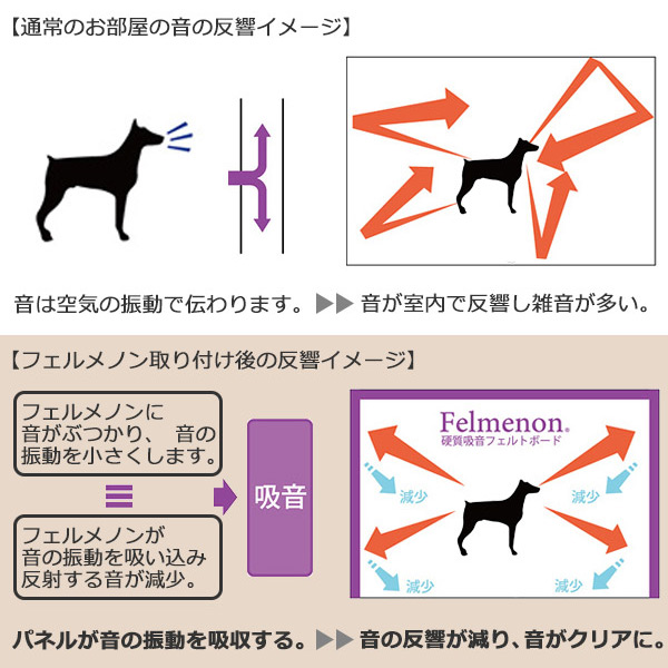音は空気の振動で伝わります。発せられた音が吸音材にぶつかると、吸音材はその振動を吸収し、跳ね返る音を少なくします。それにより、優れた防音効果が発揮されるのです。100%ポリエステル製の繊維を、高圧縮加工により高密度の板状に成型した、硬質吸音フェルトボード『フェルメノン』は、その【吸音効果】が抜群の吸音材です。
