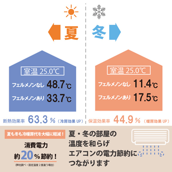 フェルメノンを貼るだけで冷暖房の効率がアップし、年間を通して節電に役立ちます。エアコンの設定温度は1年中省エネモードのまま快適に過ごせます。