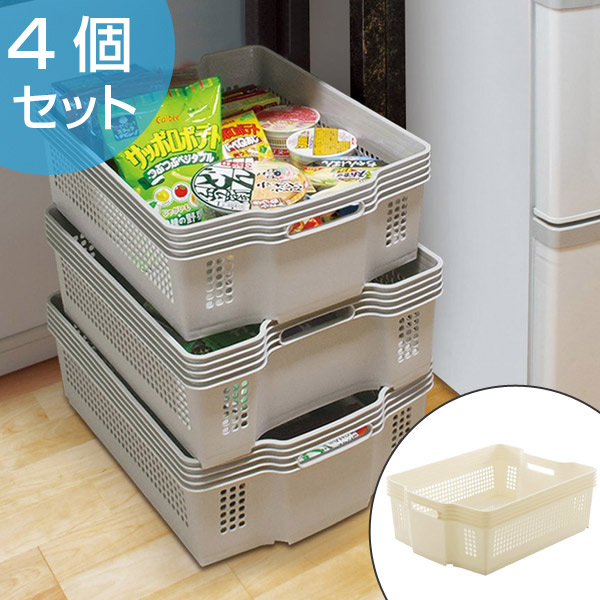 ストッカー ワイド 浅型 幅38×奥行50×高さ18cm コロ付き バスケット カゴ 日本製 ( 収納バスケット 収納 収納カゴ プラスチック キッチンストッカー 積み重ね ボックス かご プラスチック製 収納用品 マルチ収納 ) 【 アイボリー 】