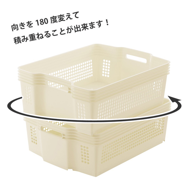 ●向きを180度変えることで、重ねてスタッキングできる浅型ワイド収納カゴ4個セットです。