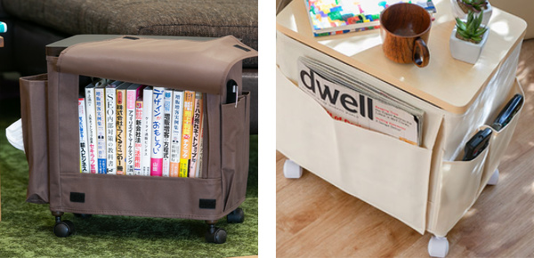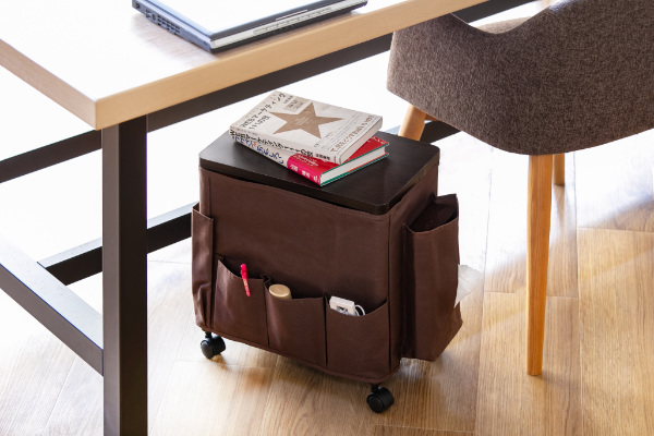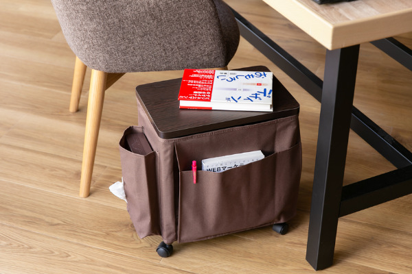 ワゴン内部には本など高さのある物も入れることができ、1台でたっぷりと収納できます。また、ワゴン側面にはティッシュやA4書類、リモコン、小物などをサイズ別に収納できるポケットもついています。