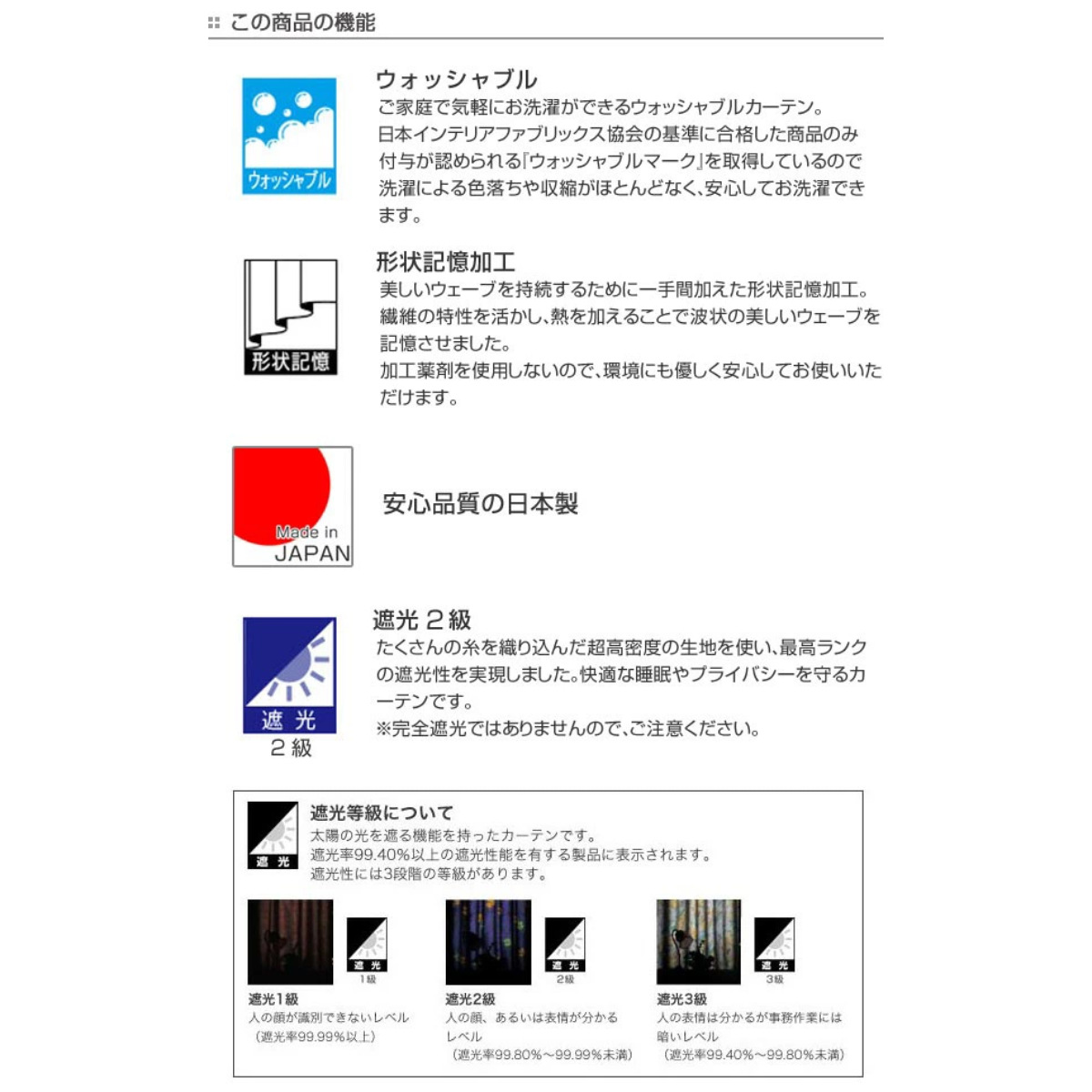 | 備考 | 遮光2級 形状記憶 75mm芯地1.5倍ヒダ リピート タテ:約 63 ヨコ:約 150(cm) ※商品名に表記されているサイズ(丈)はカーテンフックのレール取付け部分から測った長さを表記しています。 |