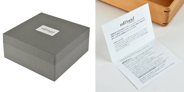 高級感のある箱と使用方法、木のお弁当箱の扱い方についての説明が記載されたカード付きですので贈り物にも最適です。