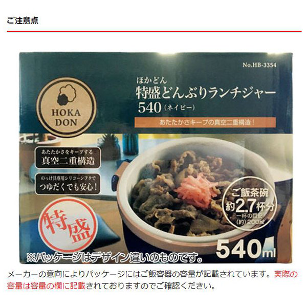 メーカーの意向によりパッケージにはご飯容器の容量が記載されています。実際の容量は容量の欄に記載されておりますのでご確認ください。