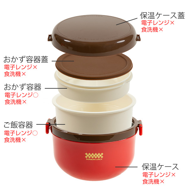 | 備考 | (耐熱温度) 口金:120度 蓋:80度 ご飯容器:140度 おかず容器:140度 止め具:130度 ※パッケージにはご飯容器の容量が記載されているため、総容量とは異なります。ご注意ください。 |